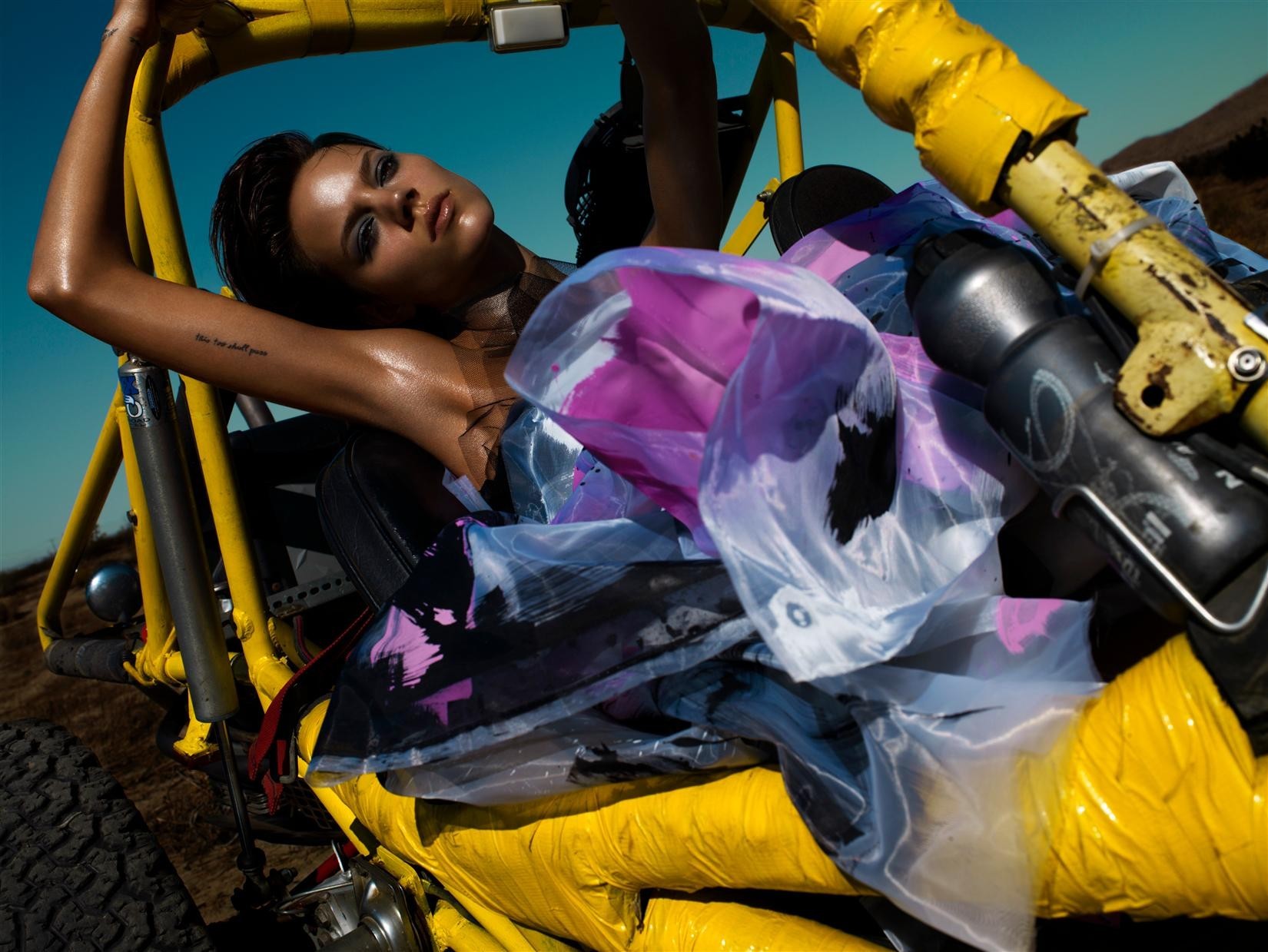 A cute girl with long hair loose, in a dress, barefoot sitting on the asphalt. Photo of a layman