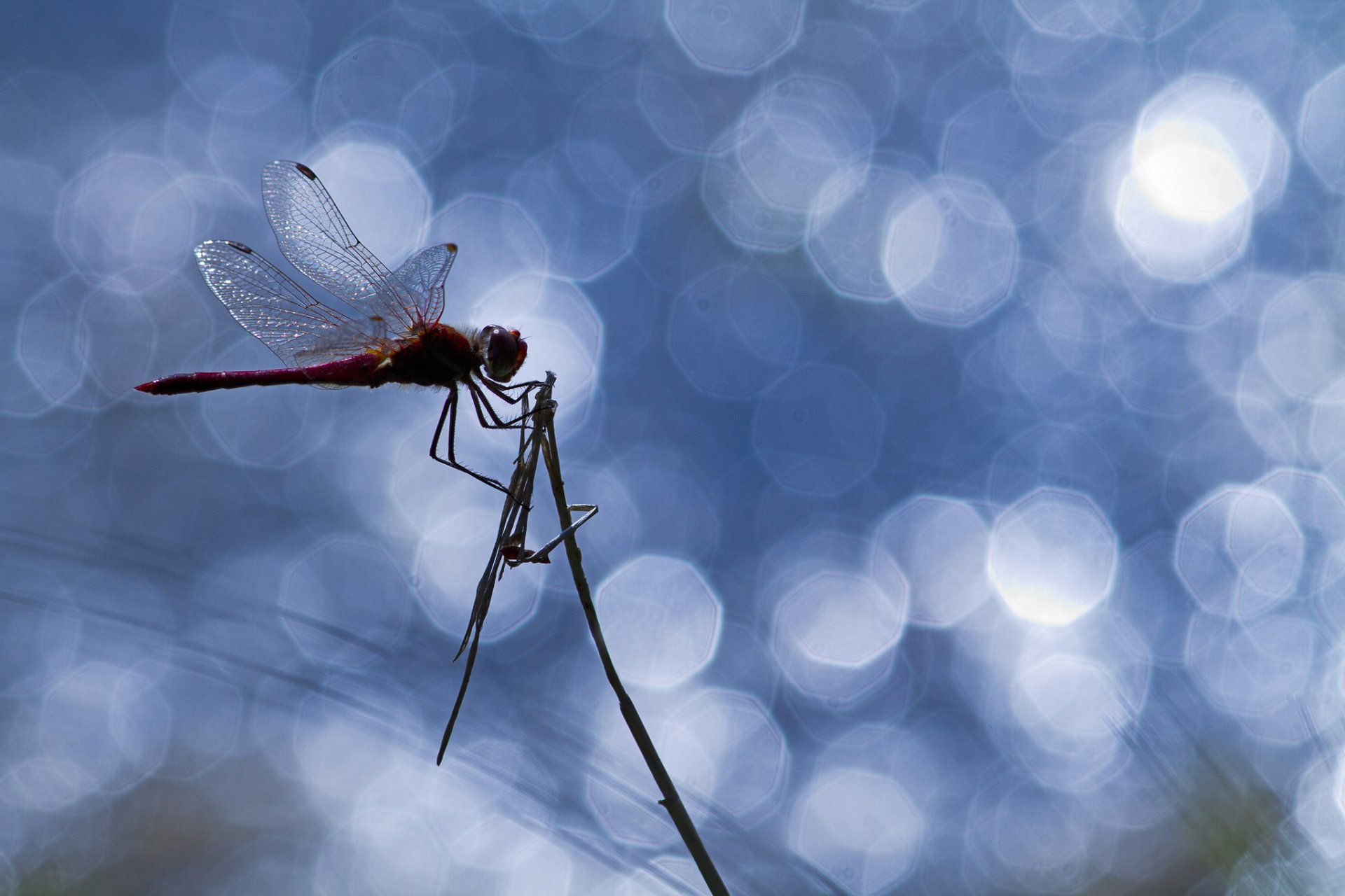 Macro shooting of a dragonfly sitting on the head of a chamelion