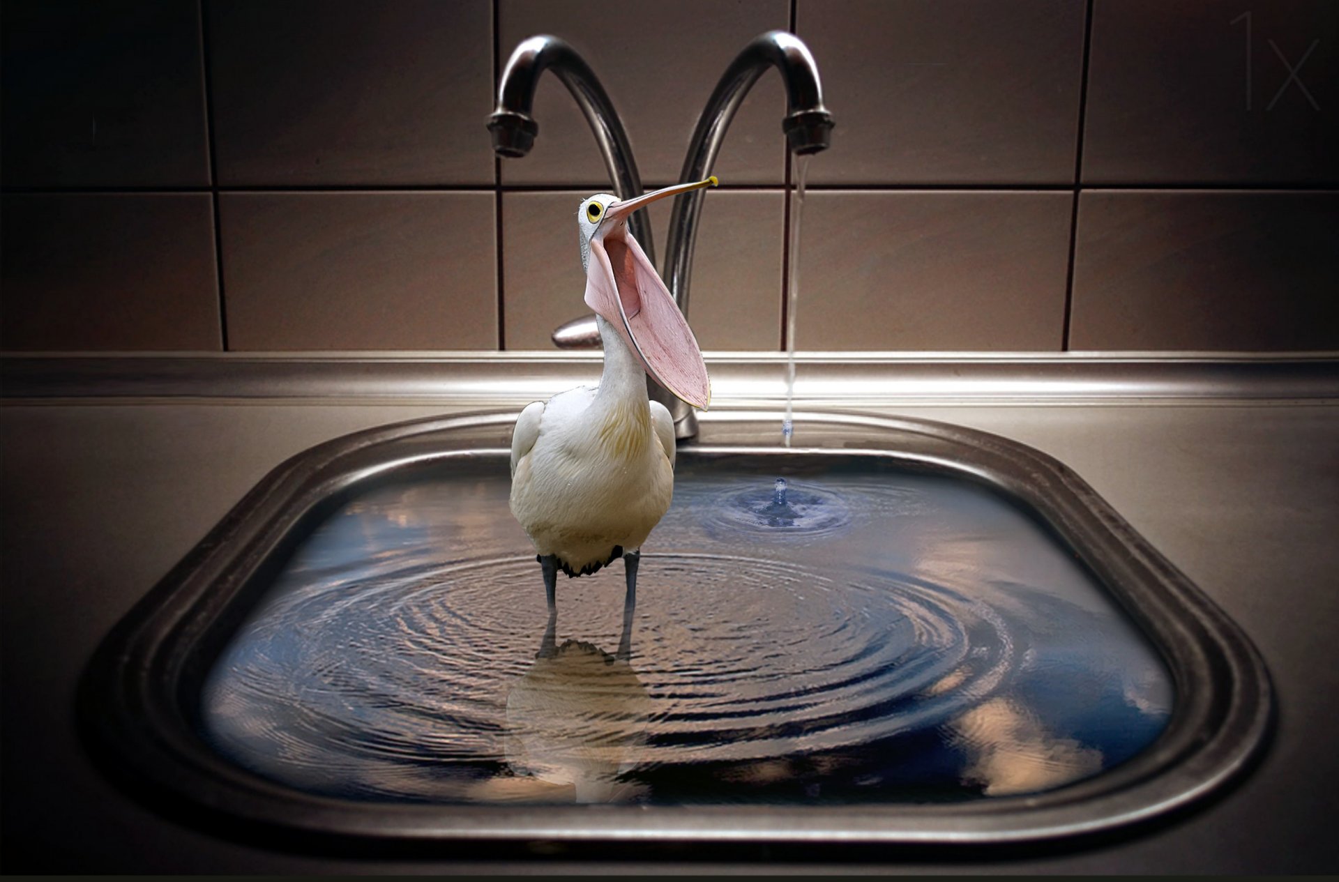 A pelican bird stands in a sink with water