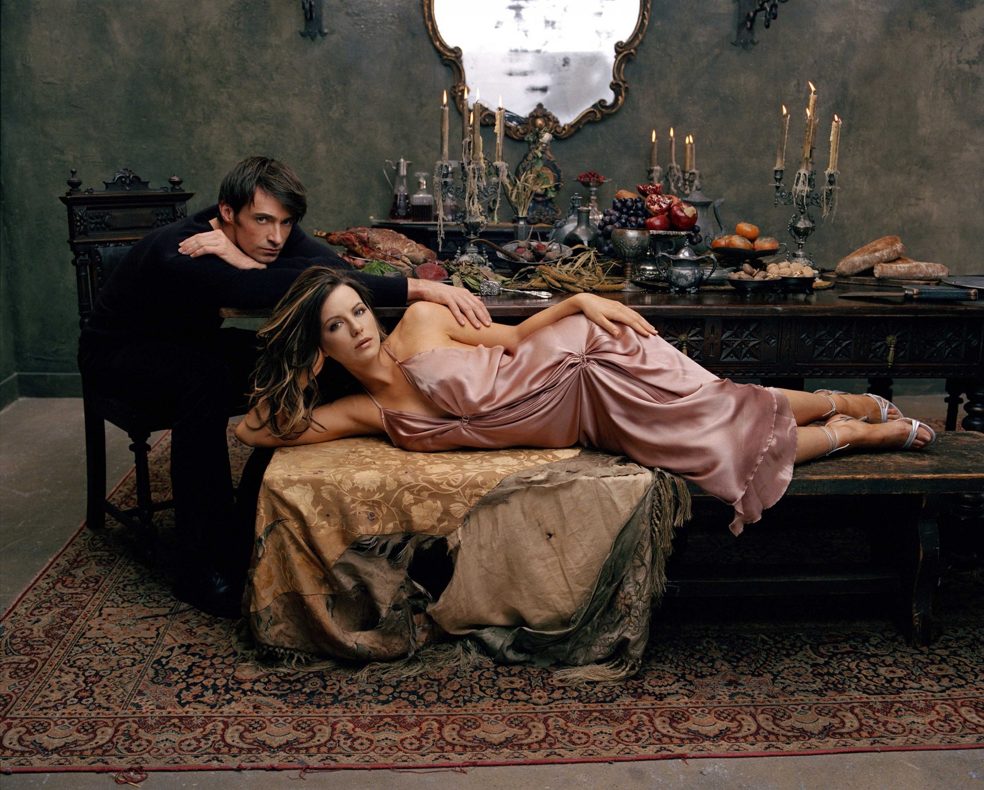 Actress Kate Beckinsale and actor Hugh Jackman at a photo shoot with an old atmosphere