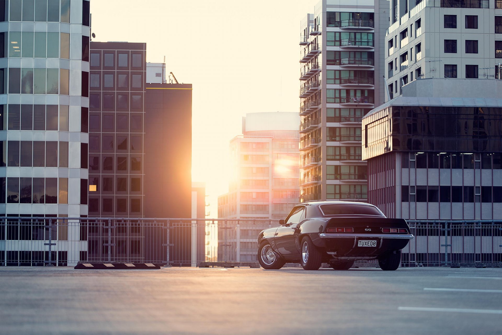 RCTRO-car pontiac47 with burning headlights on the background of urban