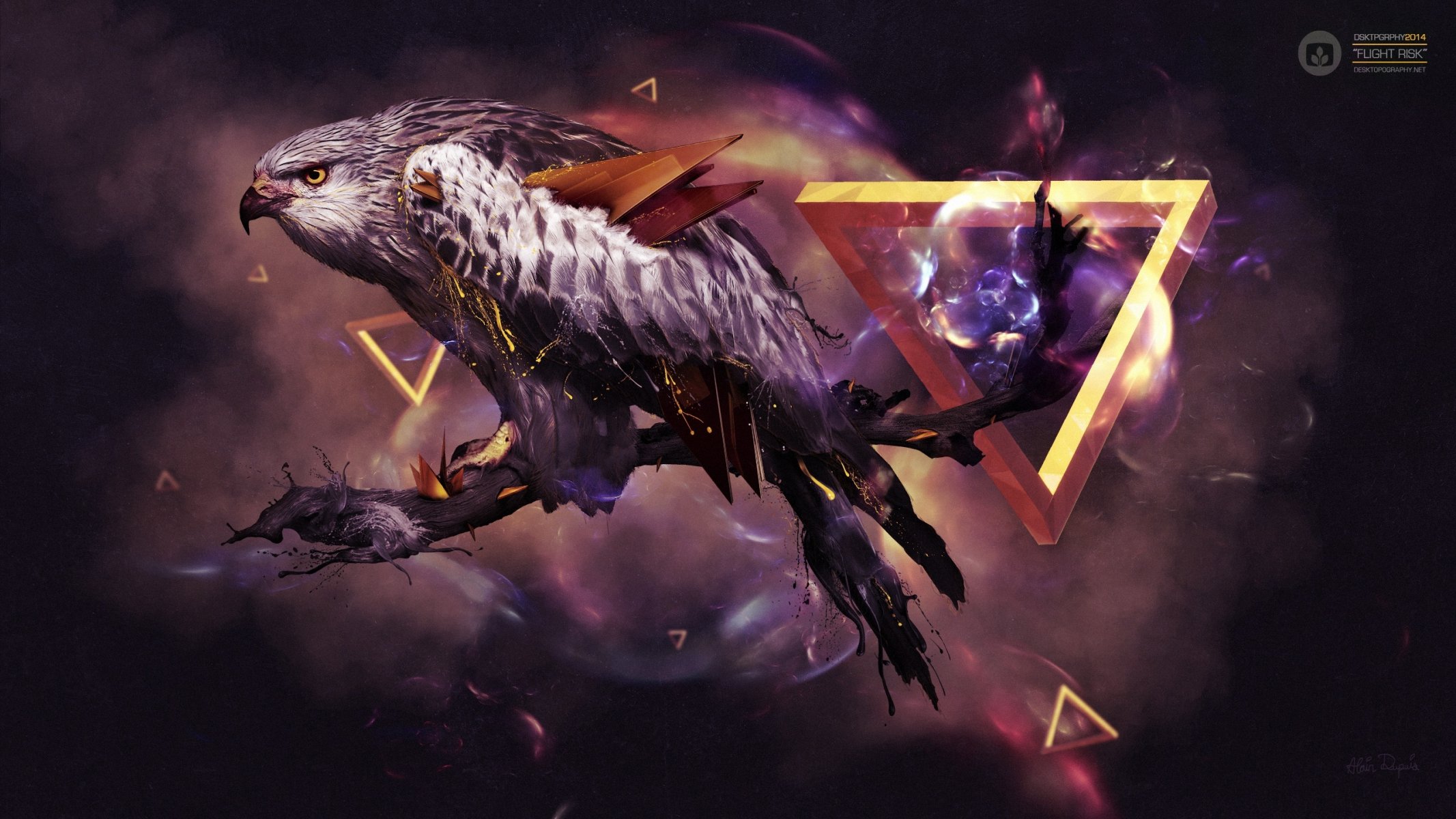 A hawk swooping down against the background of an openwork staircase, autumn trees and swirling fog