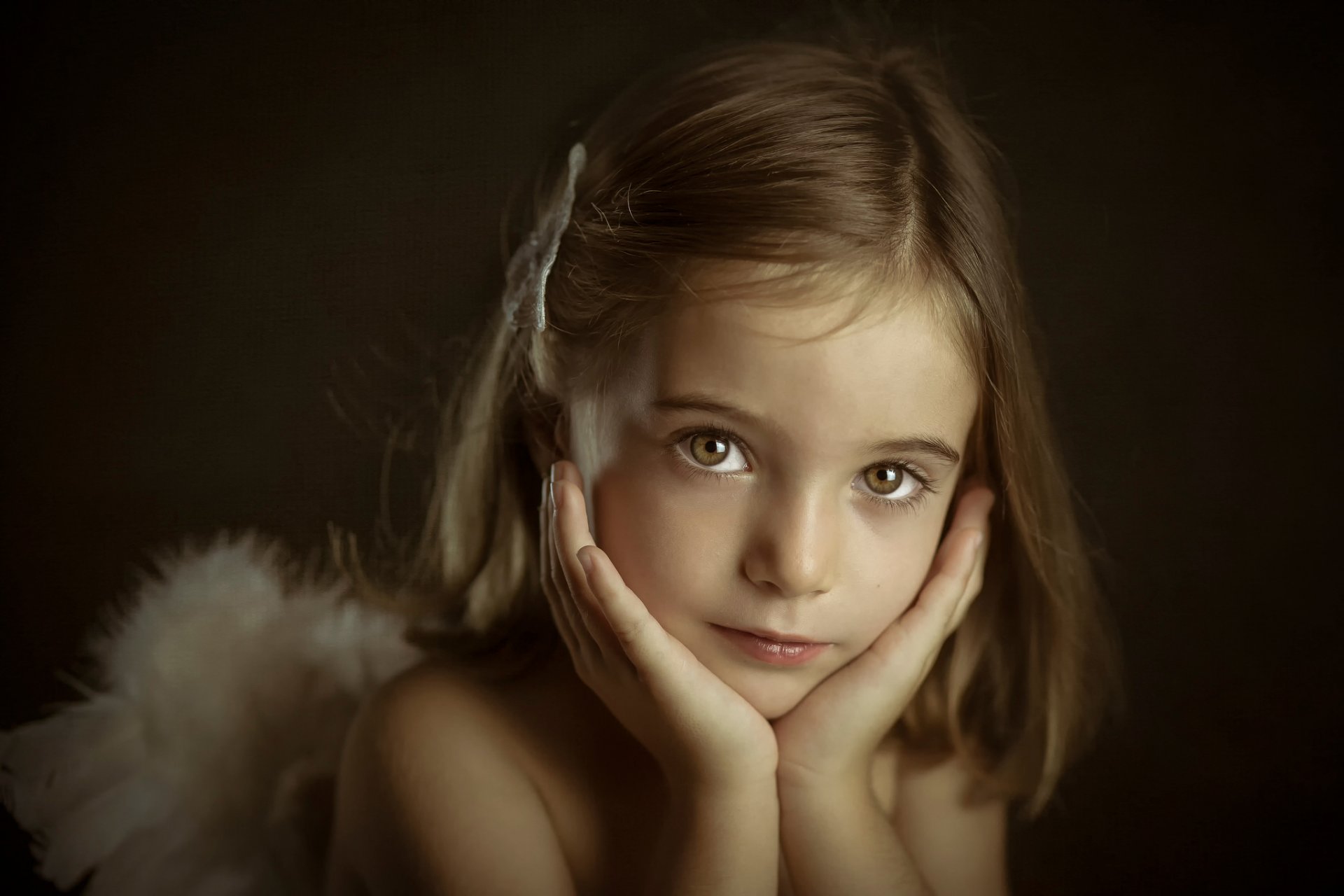 A little angel girl with her hands on her chin