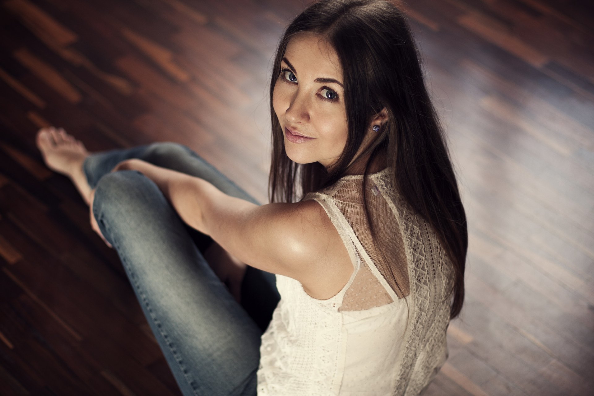 A GIRL IN GRAY AND WITH LOOSE HAIR DANCING