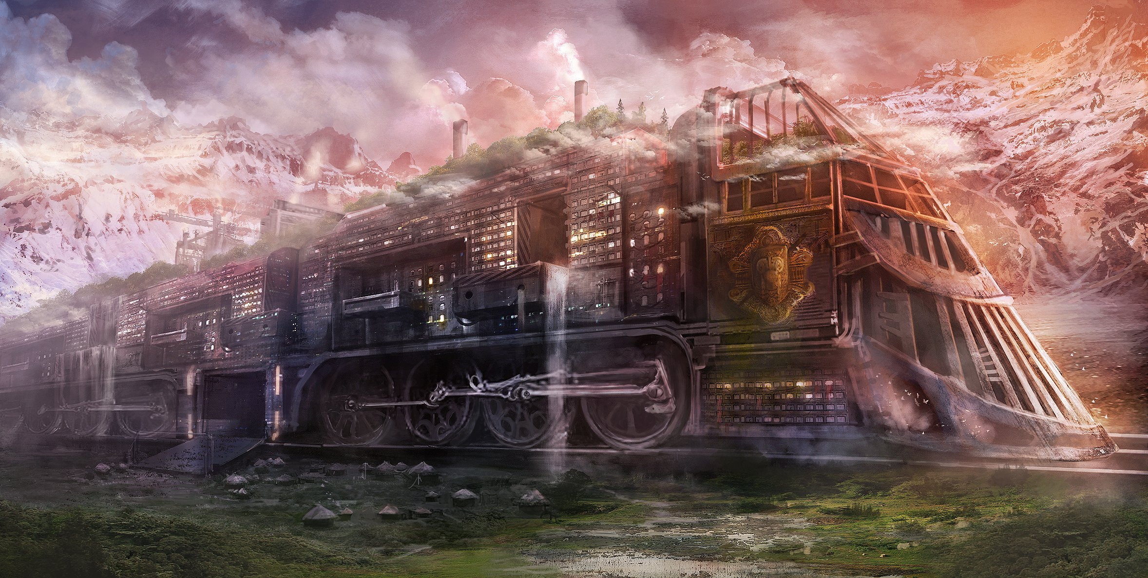 Art drawing with a train on the water