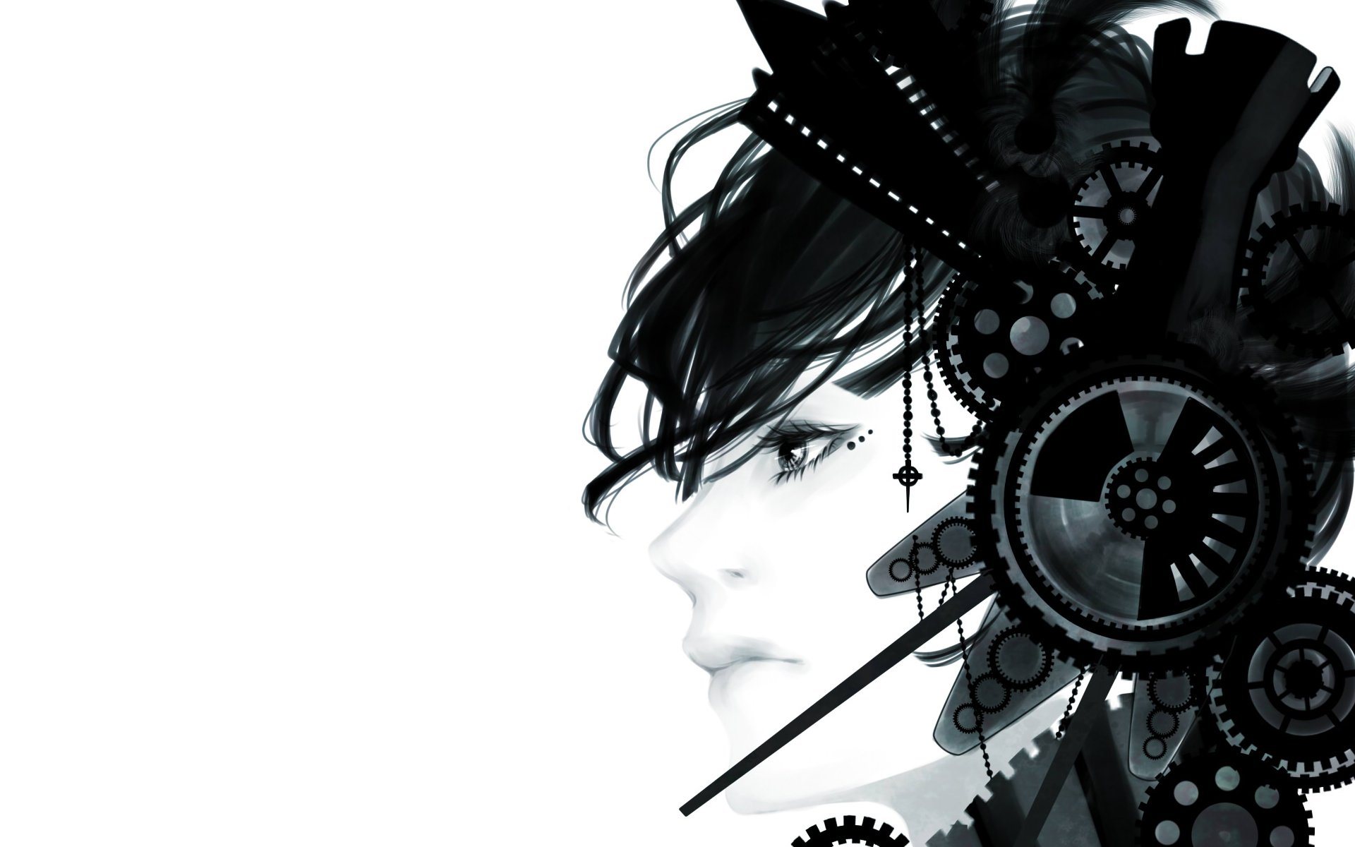 Monochrome image of a guy with mechanisms in his hair