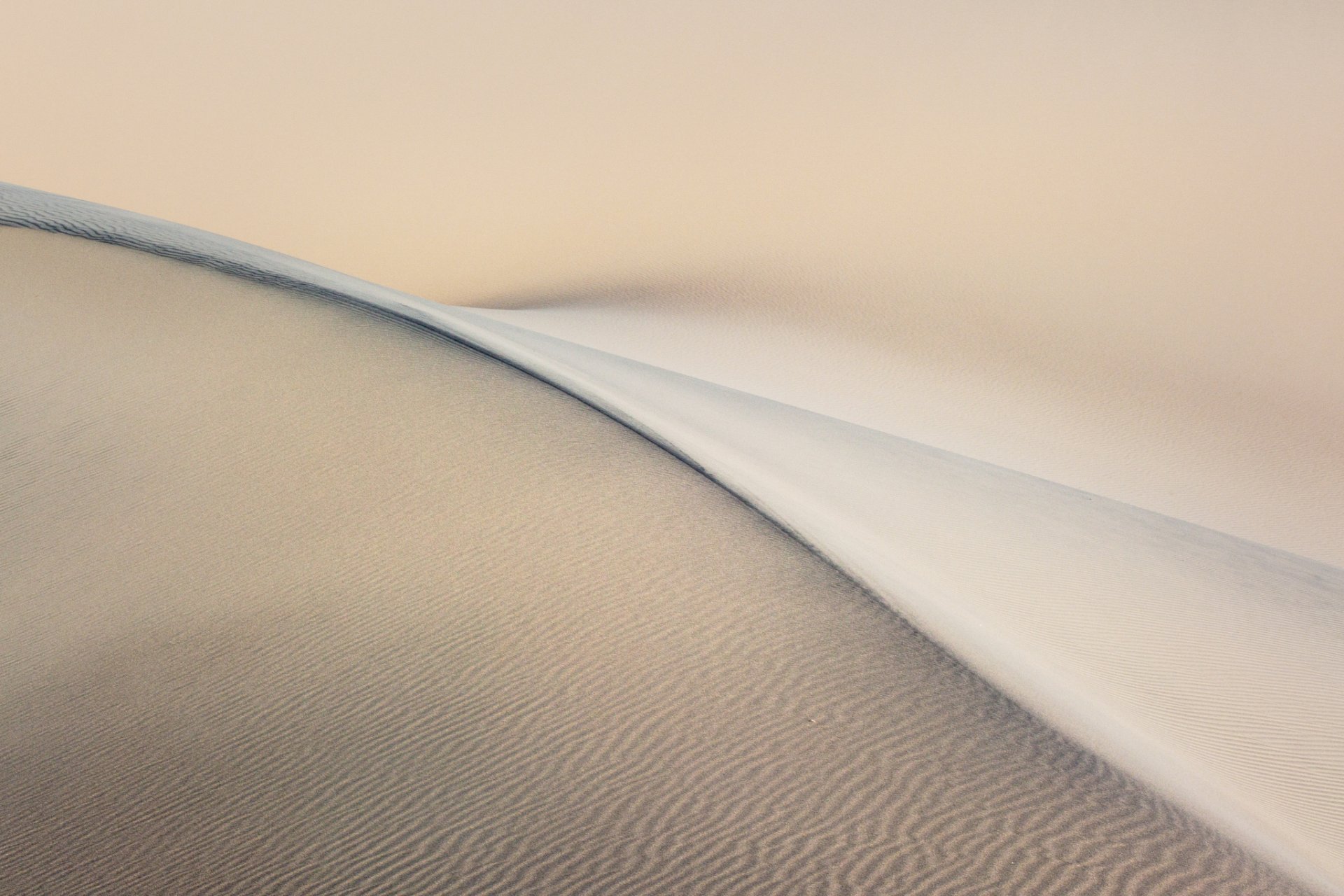 The desert at night, everything is flooded with blue moonlight, a girl in a dress climbs the dunes, closer to the sky
