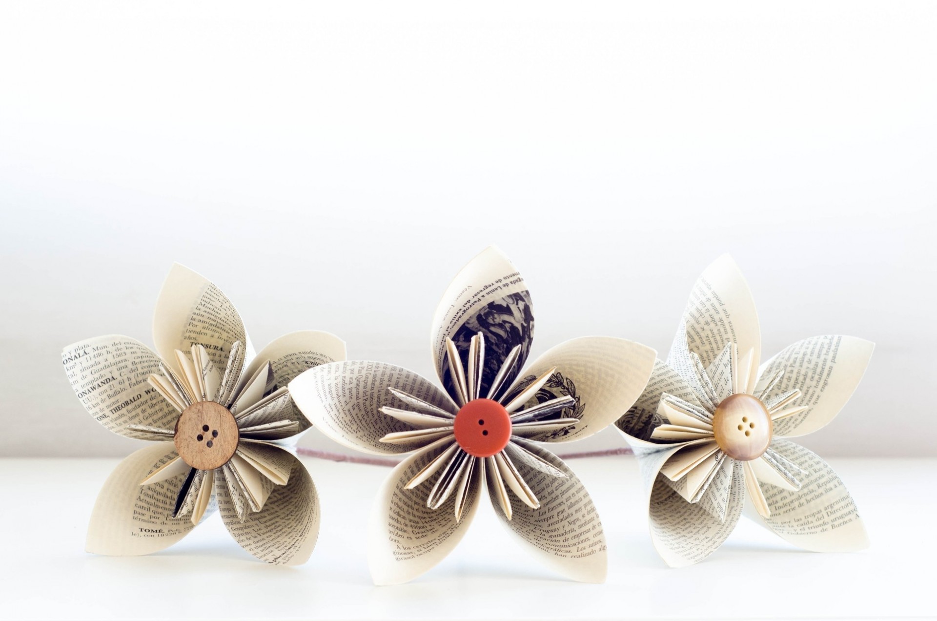 A cup of coffee with a small cookie is on the table, next to it are: a newspaper, glasses and a glass with a flower