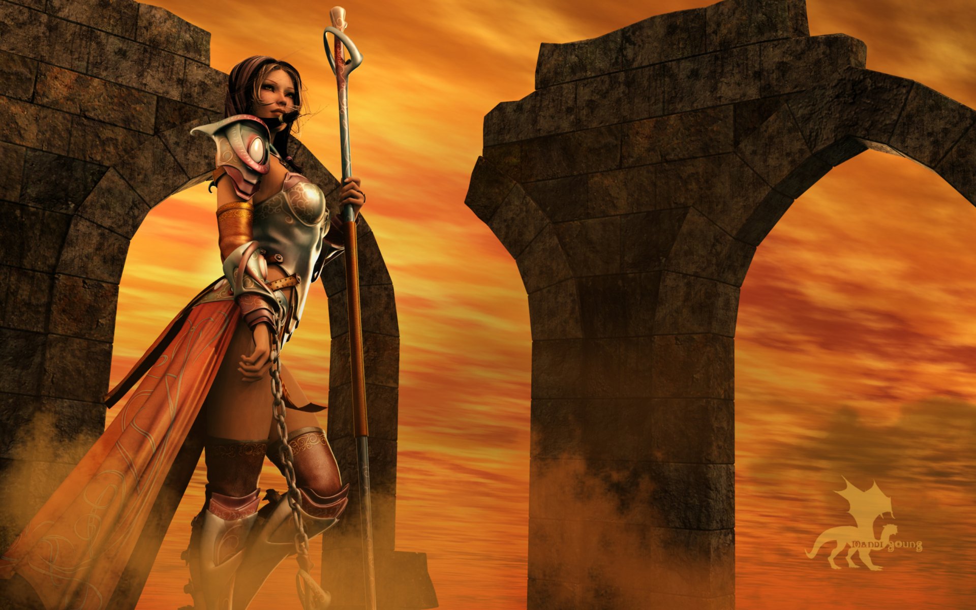 A warrior from a computer game in the pouring rain on the background of a volcano