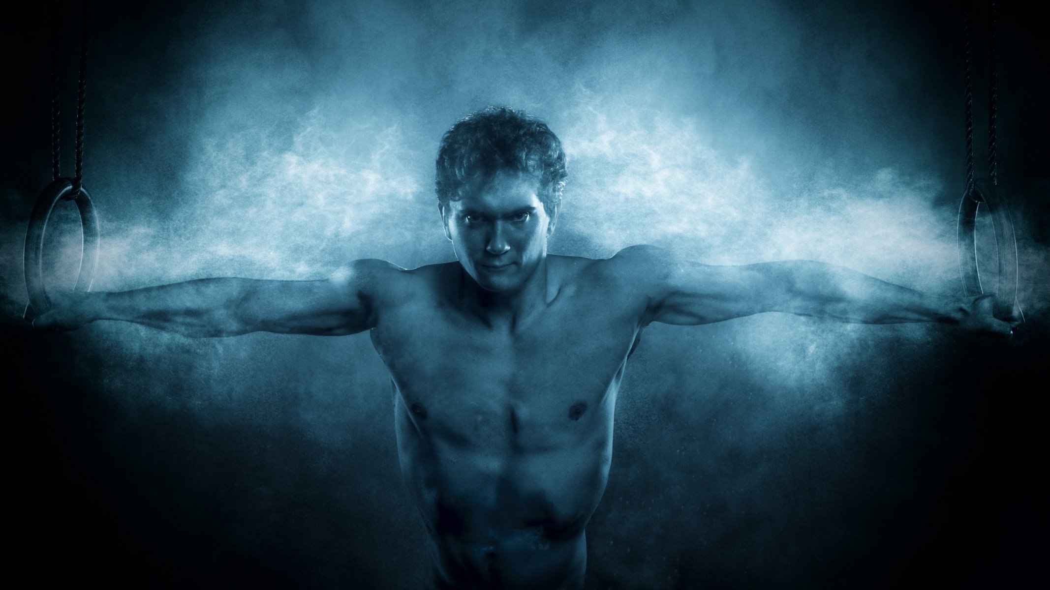 Athlete gymnast hanging on rings