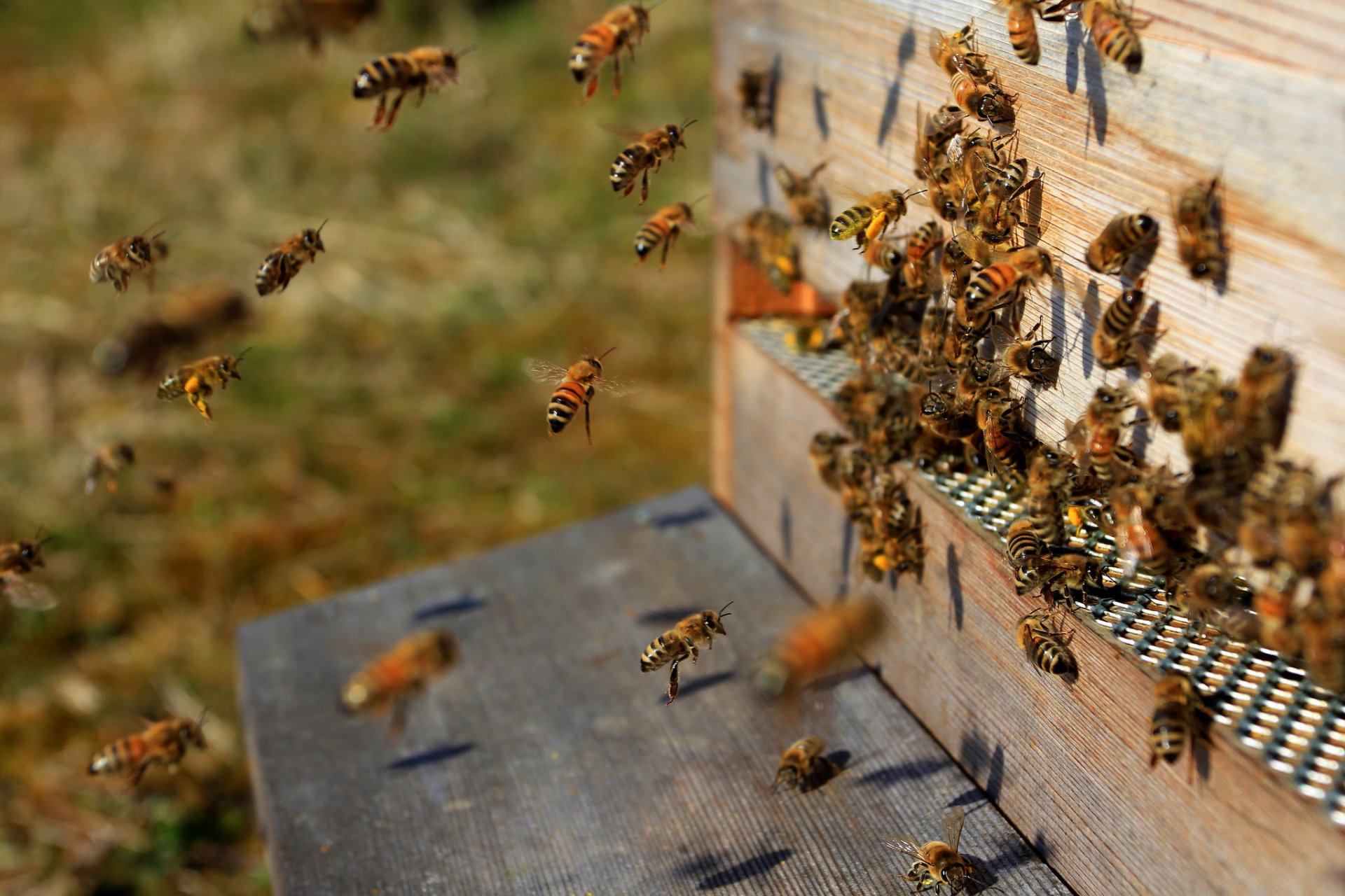 A swarm of bees at their hive