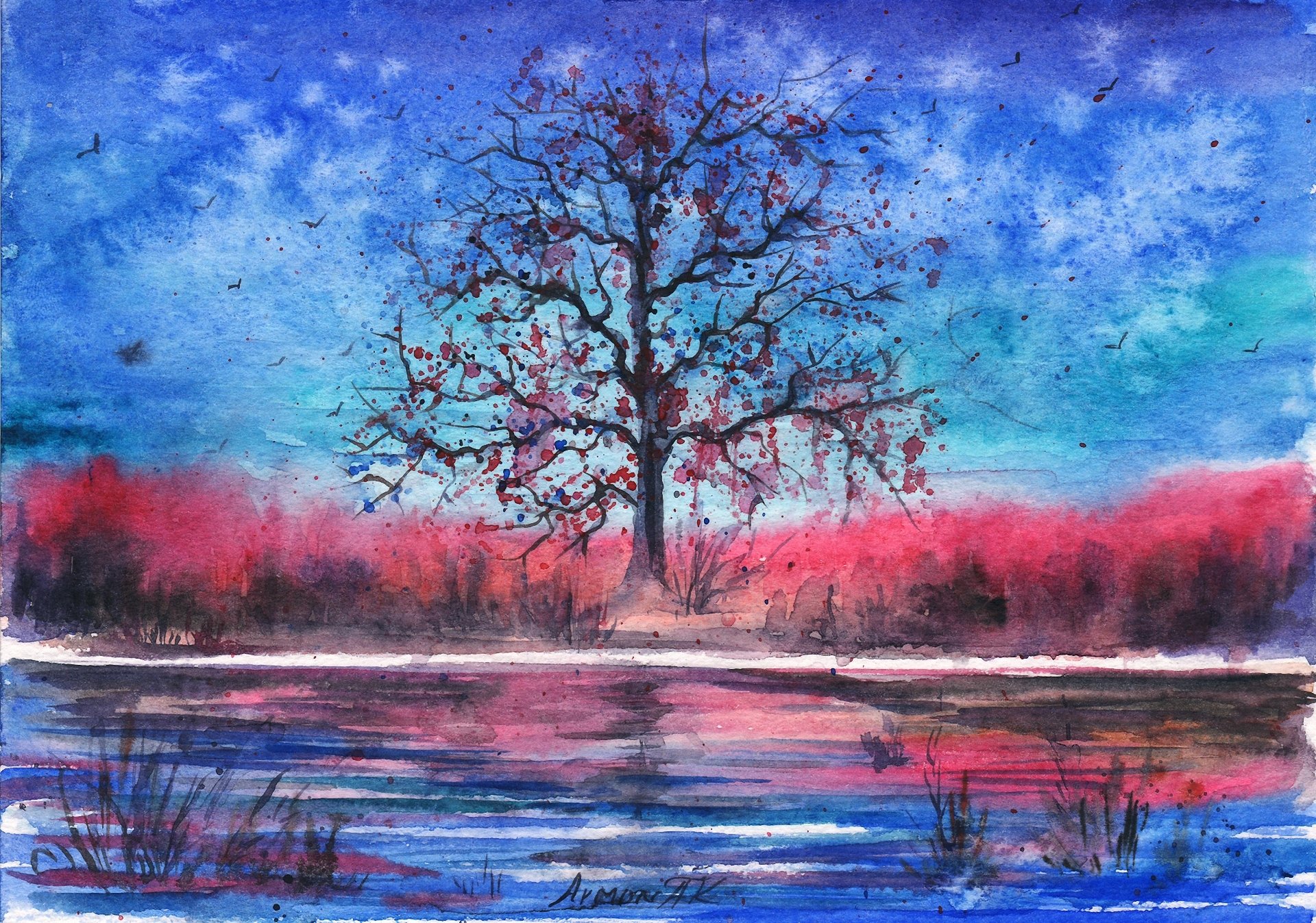 Landscape painted tree birds river