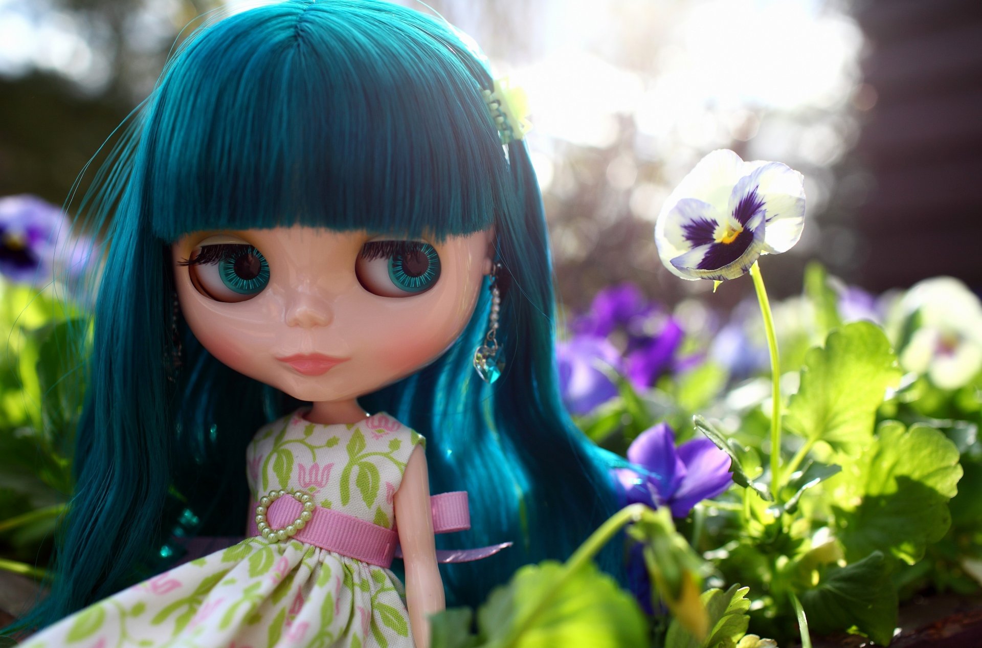 Sad doll in a flowered dress next to flowers