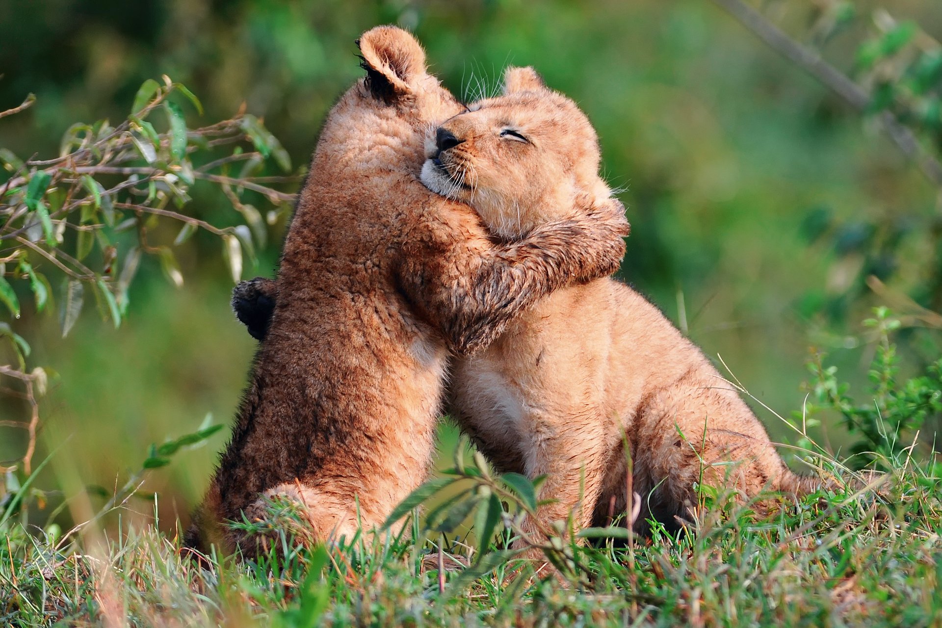 Two little lion cubs hug
