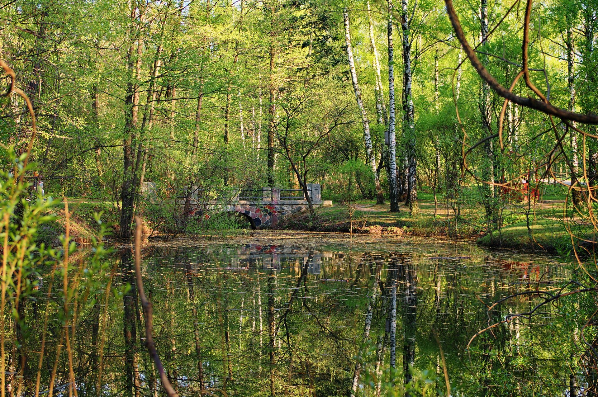 Pond in the autumn forest. Reflection of bright foliage in the blue surface of the water