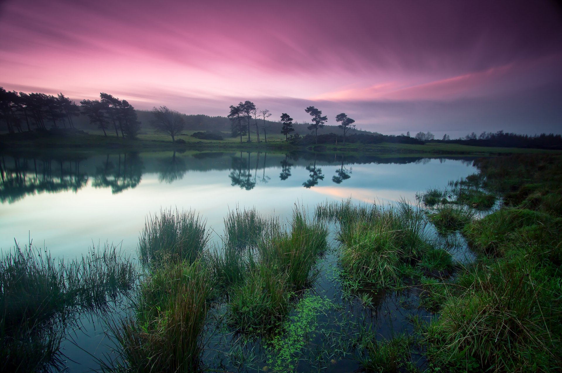 Rushing red sunset over the lake