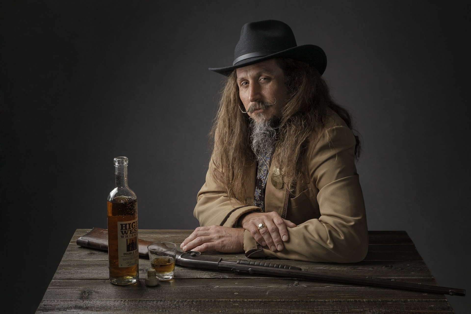 A long-haired man with a beard and a hat in the image of a cowboy is sitting at a wooden table, on which there is a bottle of whiskey and a half-filled glass, as well as a gun