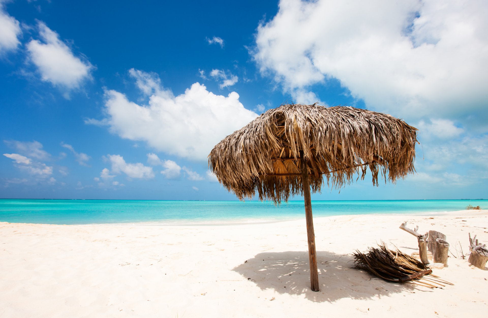 On the beach there is white sand an incredible view of the rocks where trees grow blue coast blue sky