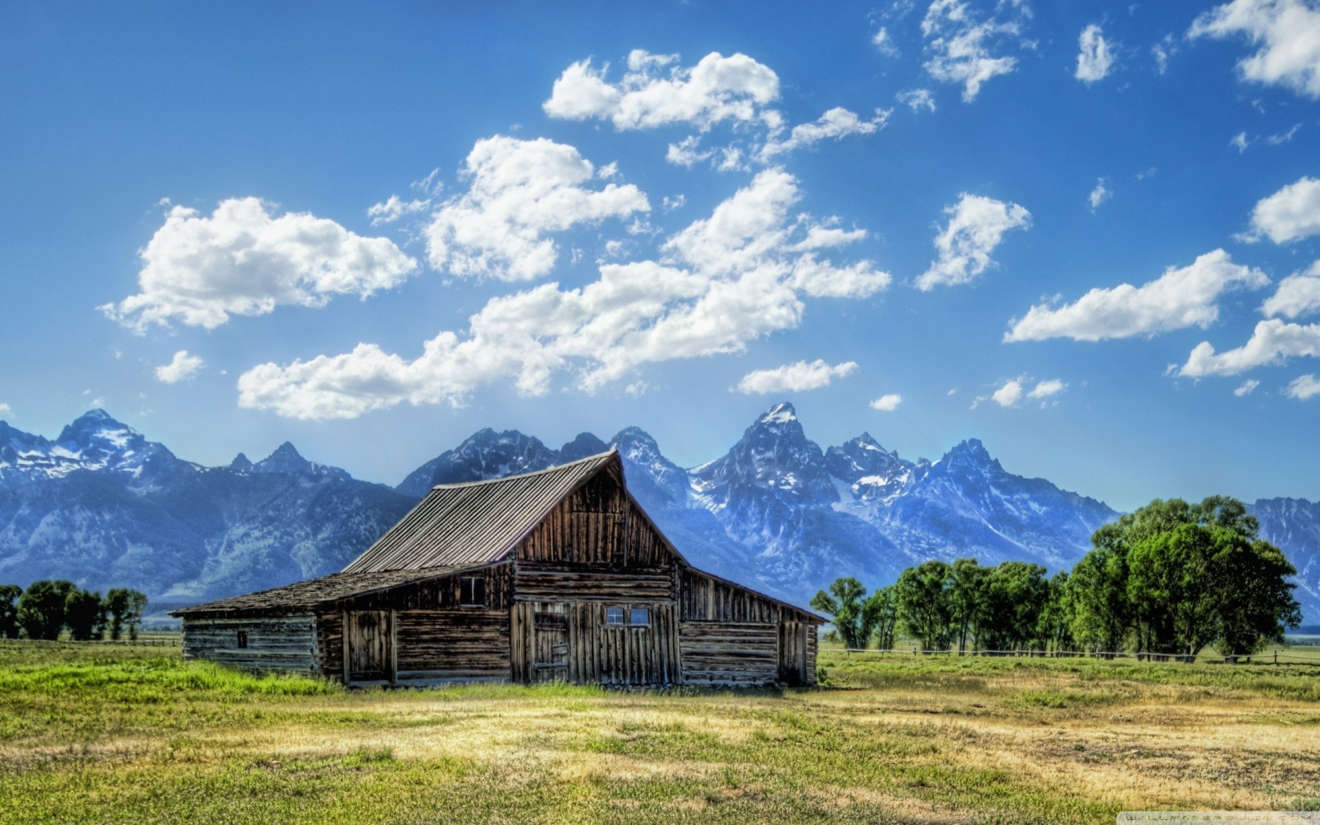 Sunny landscape of a barn in the mountains