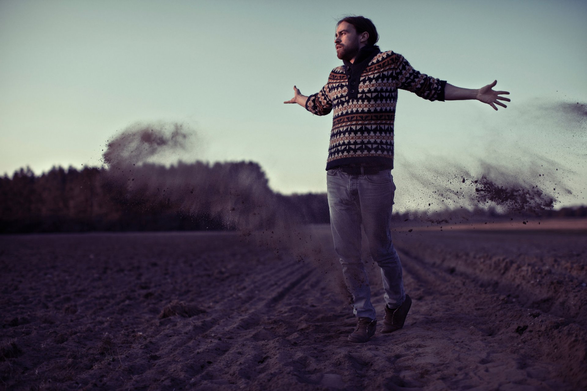 Photo of a guy walking on a field of land