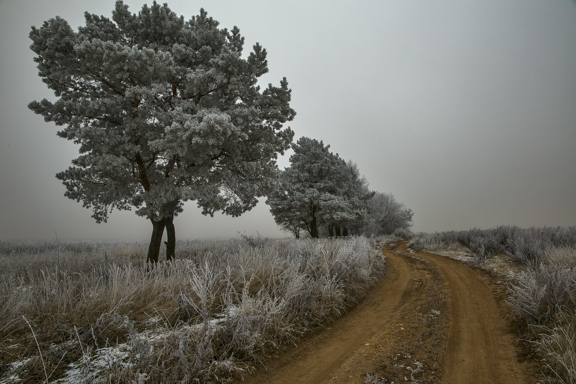 Autumn frost. white trees, dirt road