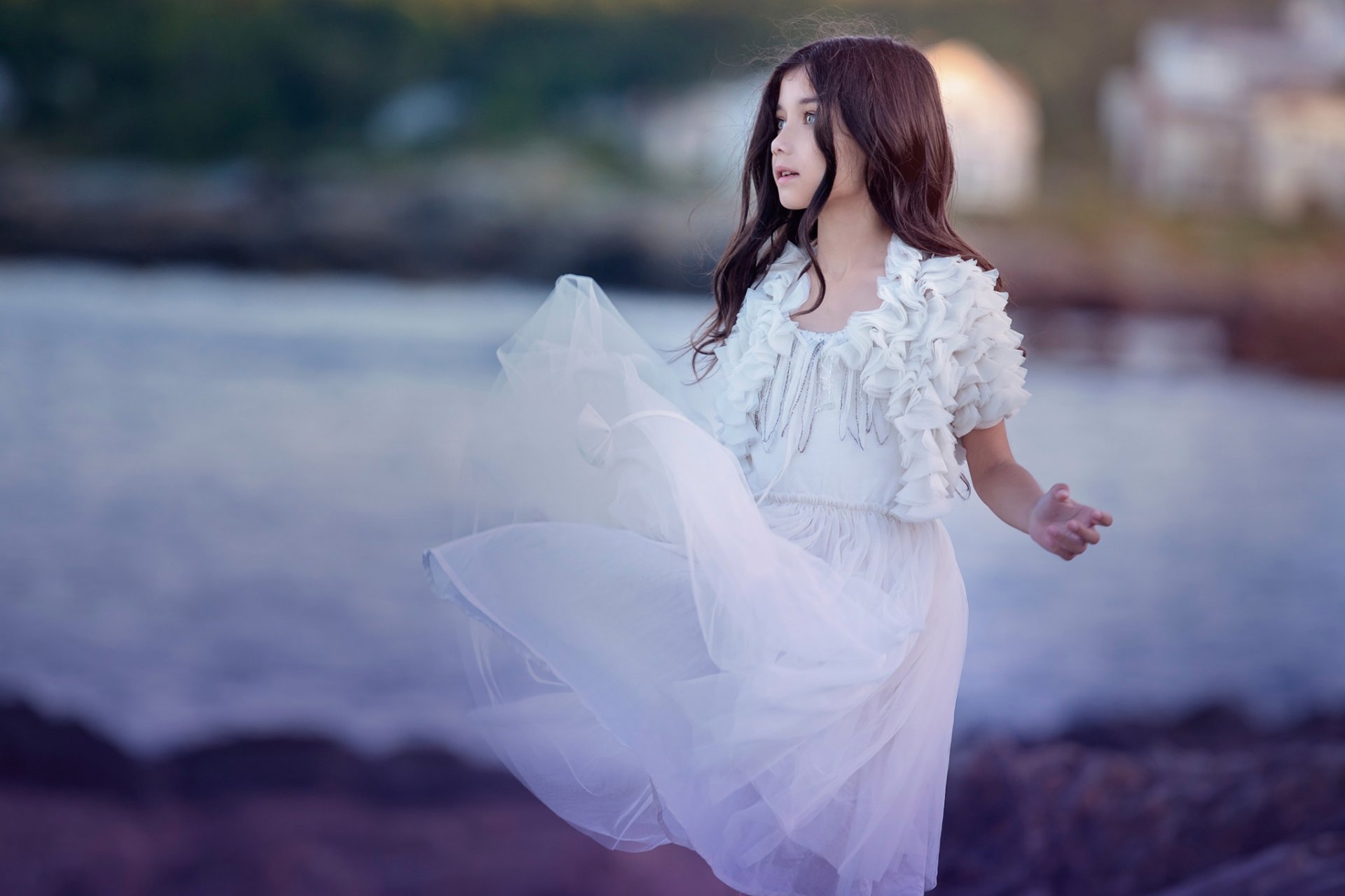 The girl is spinning in a beautiful white dress