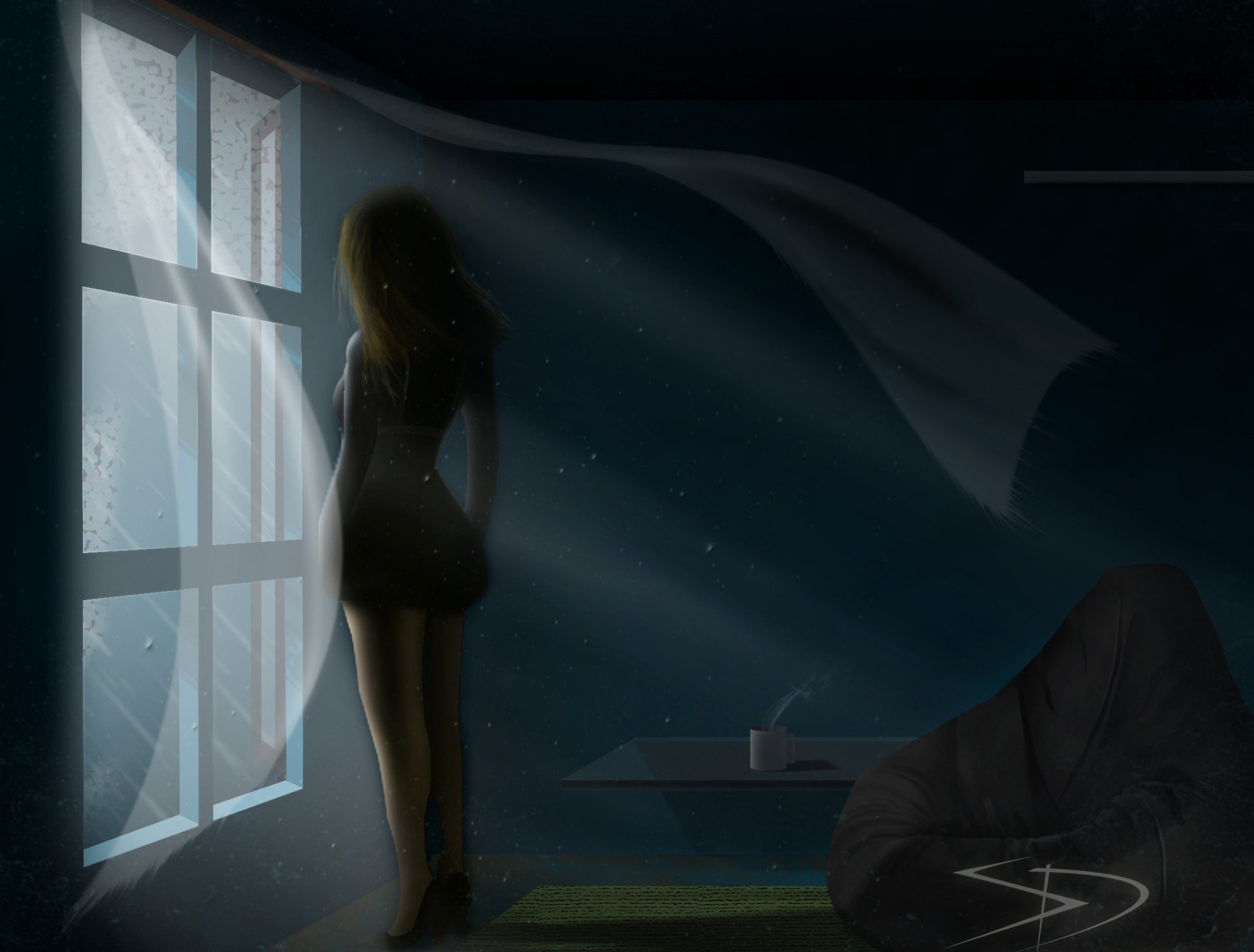 Image of a girl looking out of a night window