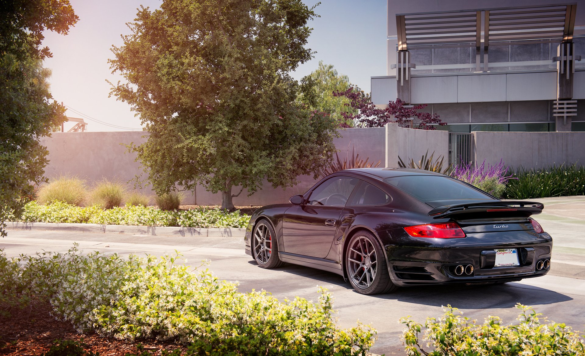Stylish sports car with a spoiler and beautiful disks on the background of a gray building