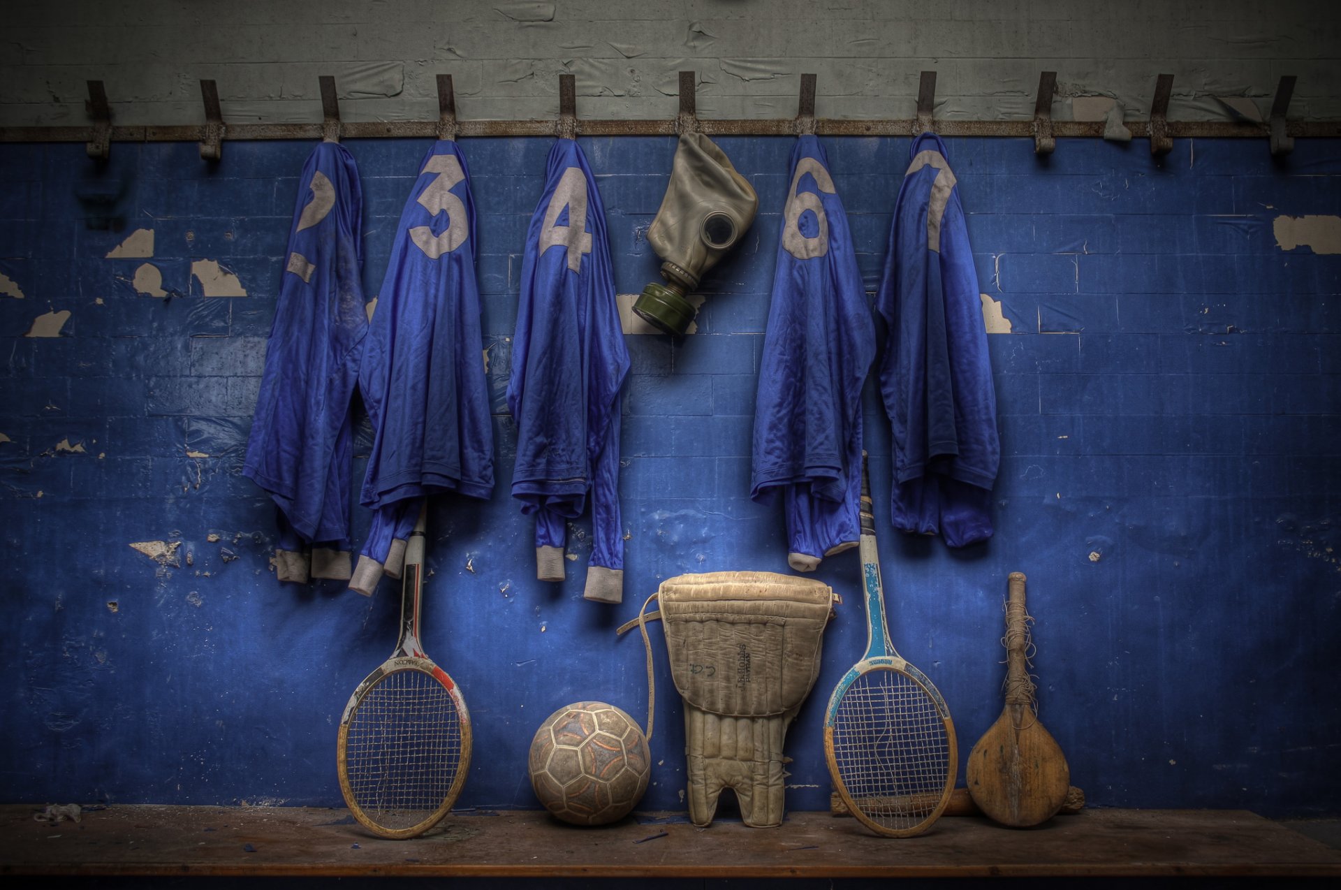 Old sports equipment on a blue background
