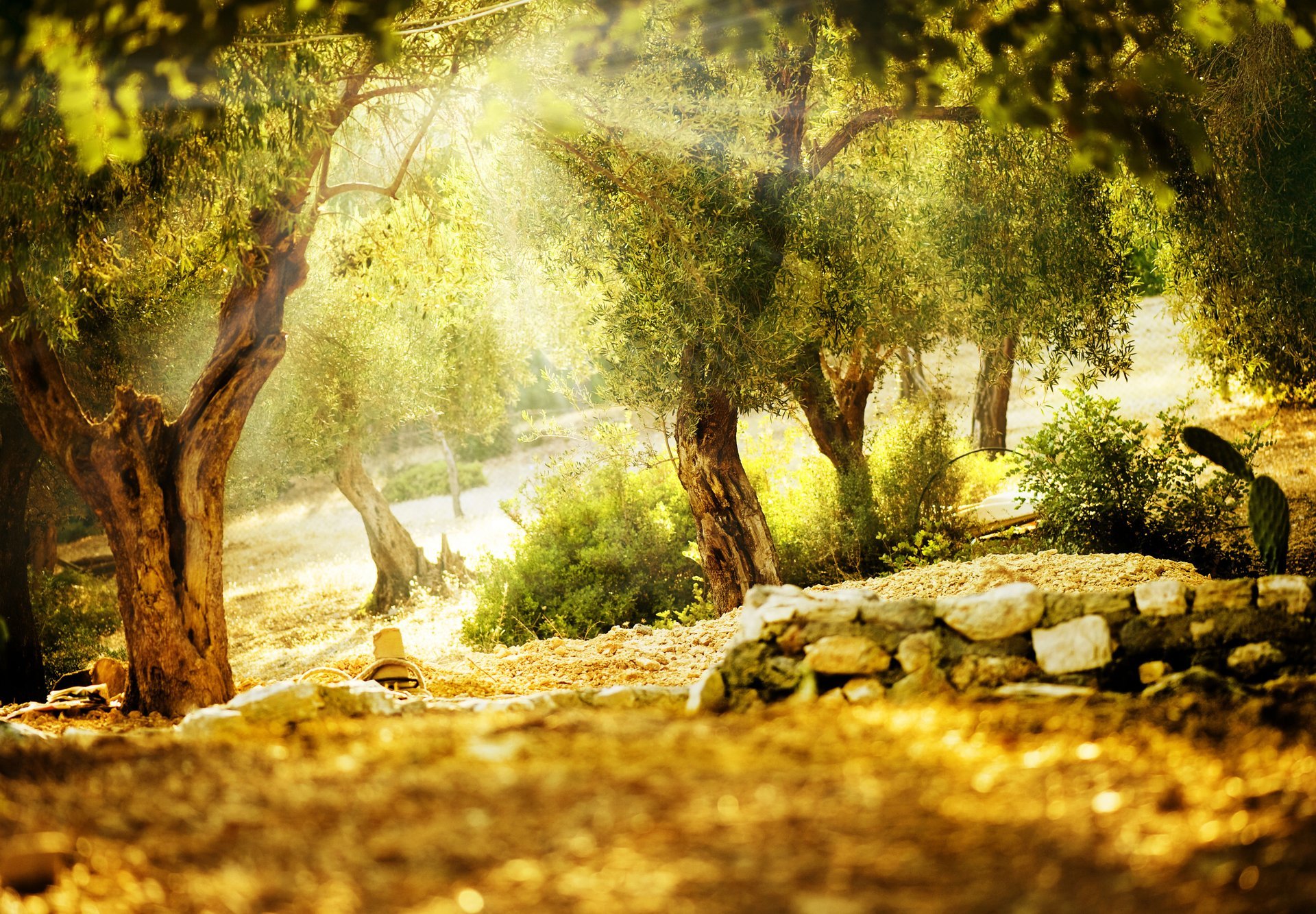Hills, rocks, trees in a small village in sunny day