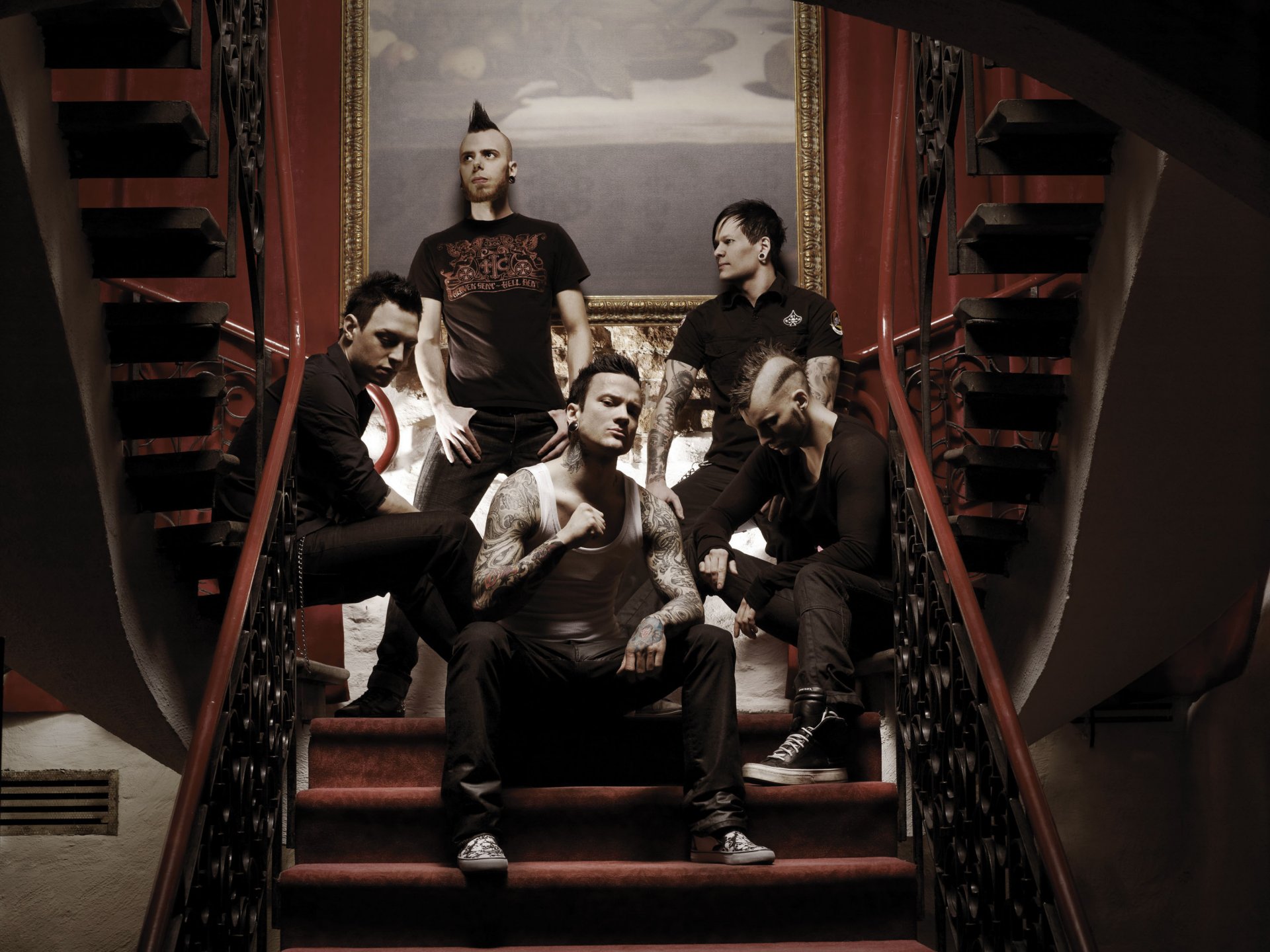A musical group consisting of men sitting on a staircase with a carpet