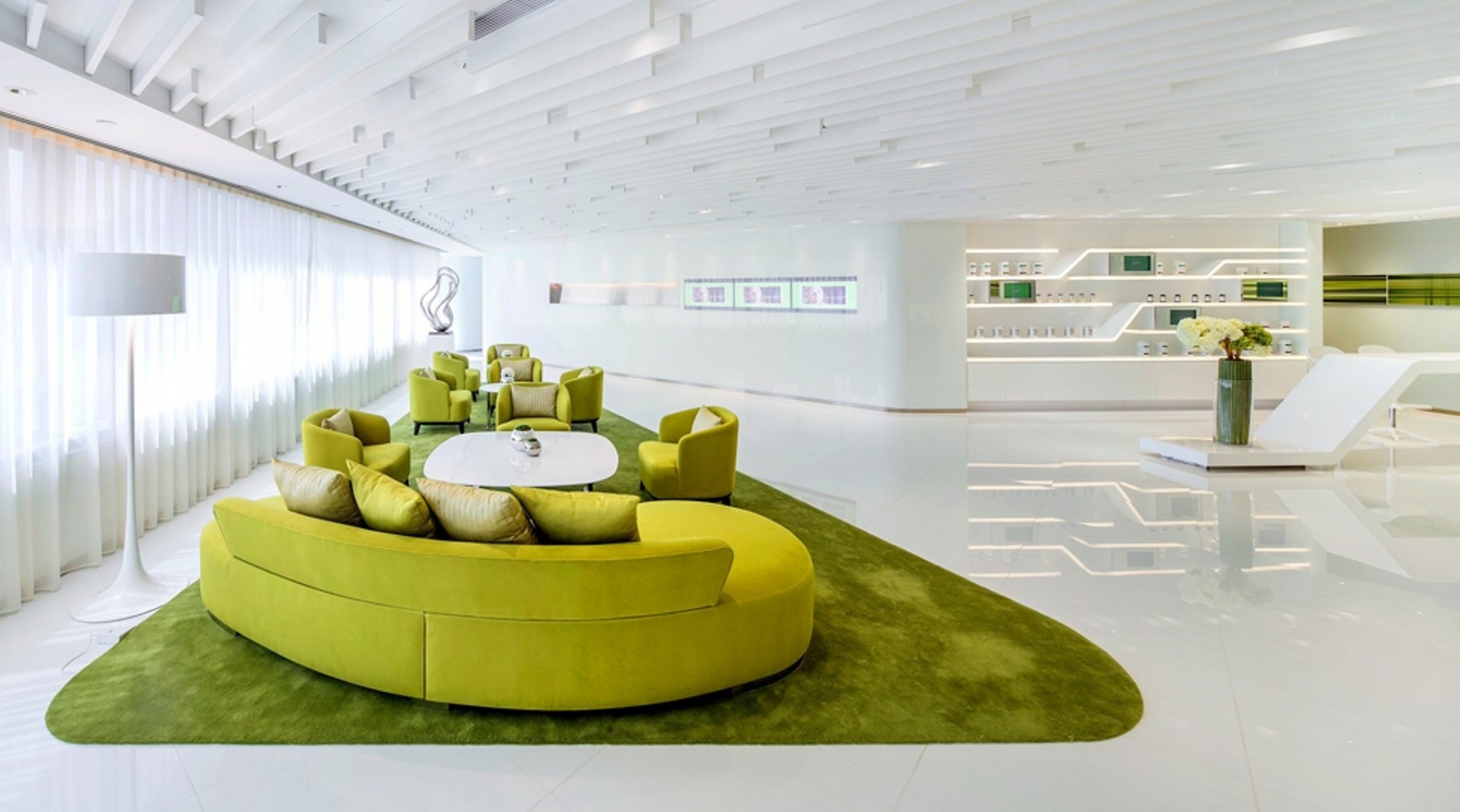 The living room is made in a white and green style