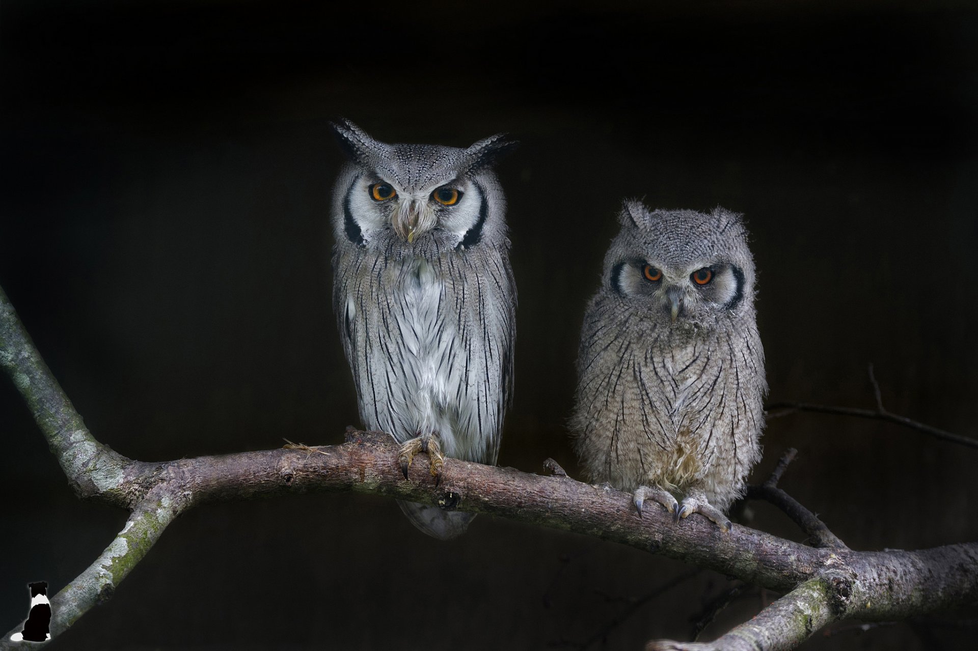 Two owls are sitting on a branch