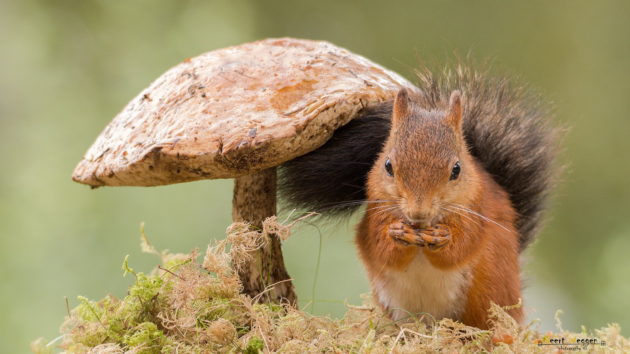 Squirrel under a mushroom in the forest. macro photography