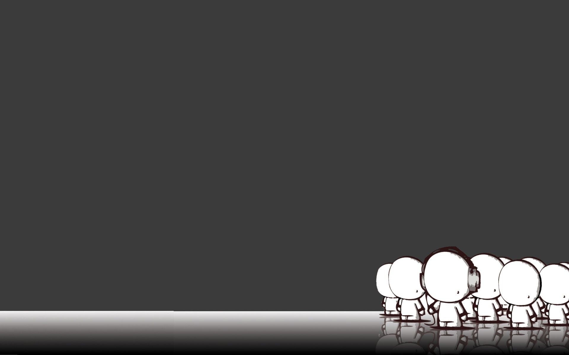 A group of cartoon men with large heads. One of them is wearing headphones