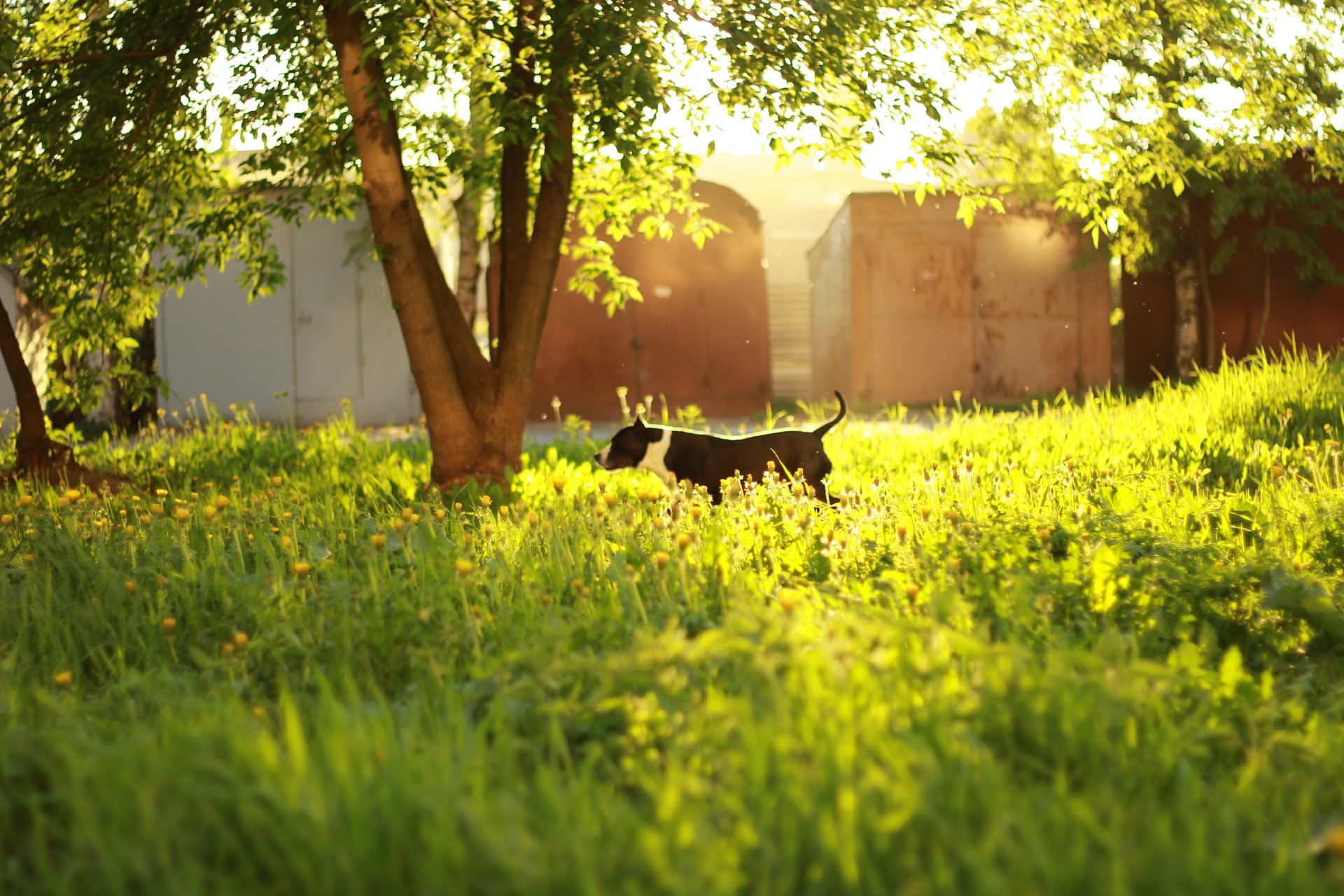 A dog on the grass next to a tree in leaves