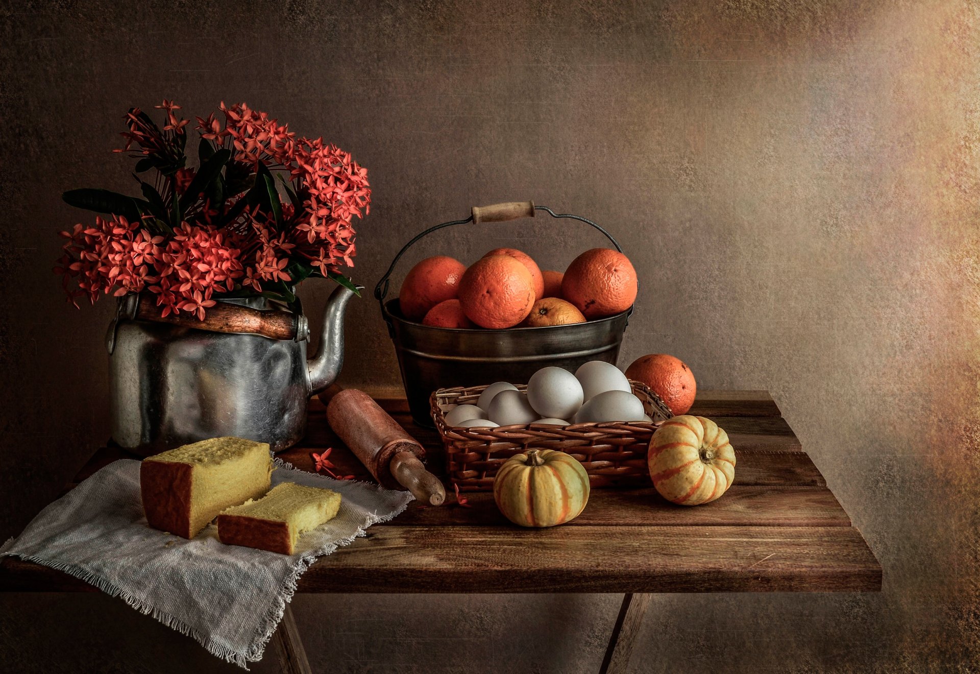 Still life flowers in a teapot, bread, oranges and pumpkins