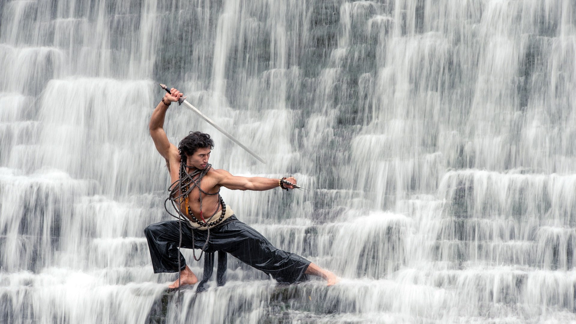 A guy in a suit with a red tie, a beige folder and an open black umbrella stands in the rain against the background of the city and the dawn