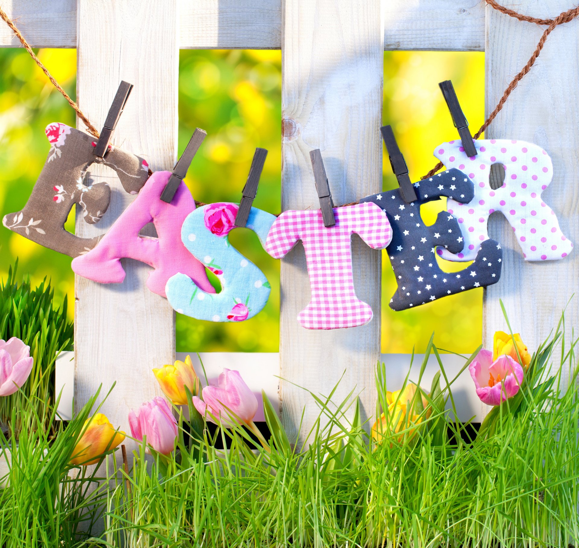 Red tulips and white daisies in the garden. Blue watering can. Green background