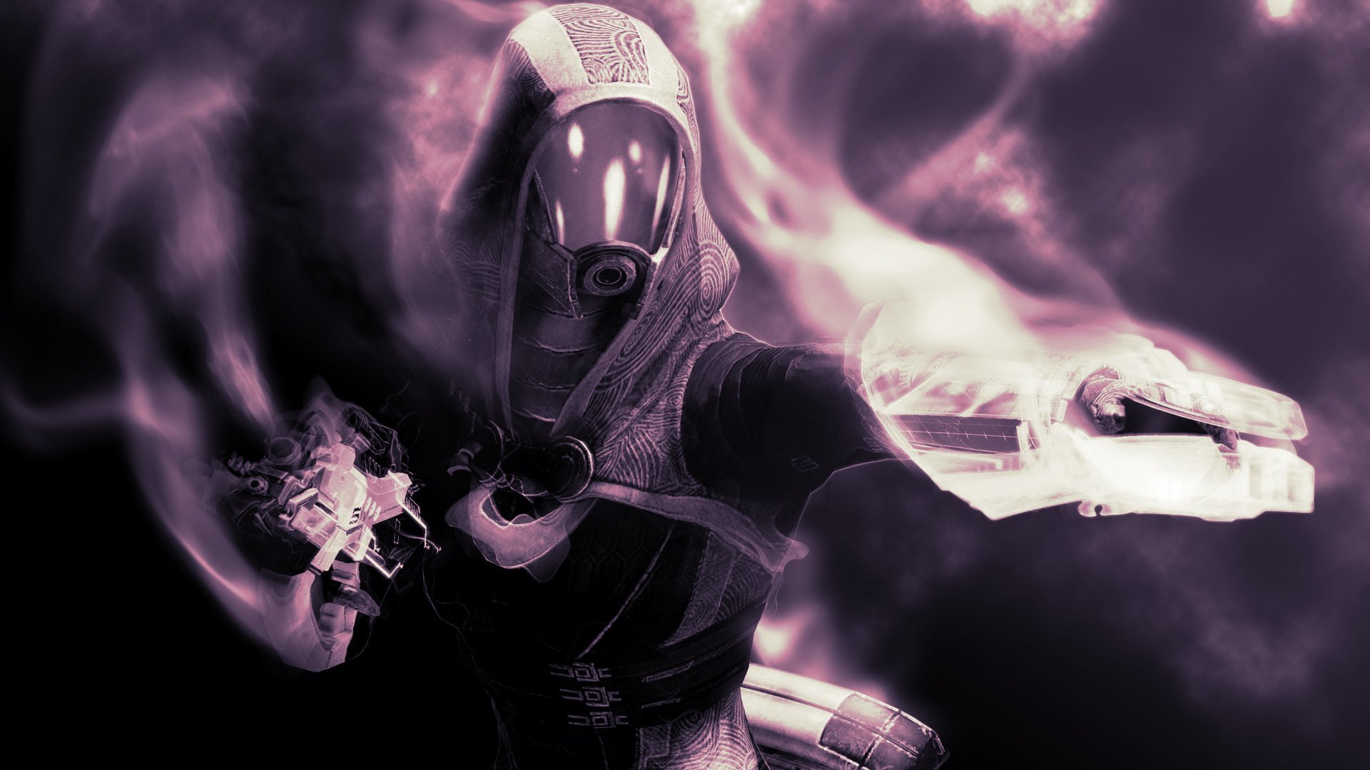 Fantastic creatures in outer space in armored suits. Blue skulls glow in helmets