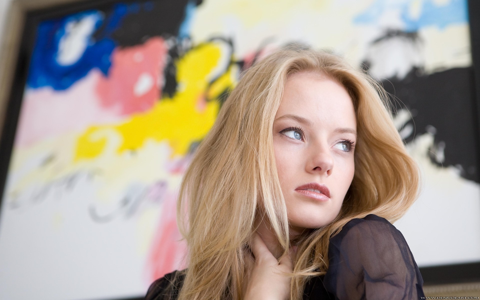 Emily Blunt in an unusual board on a background of gray wallpaper