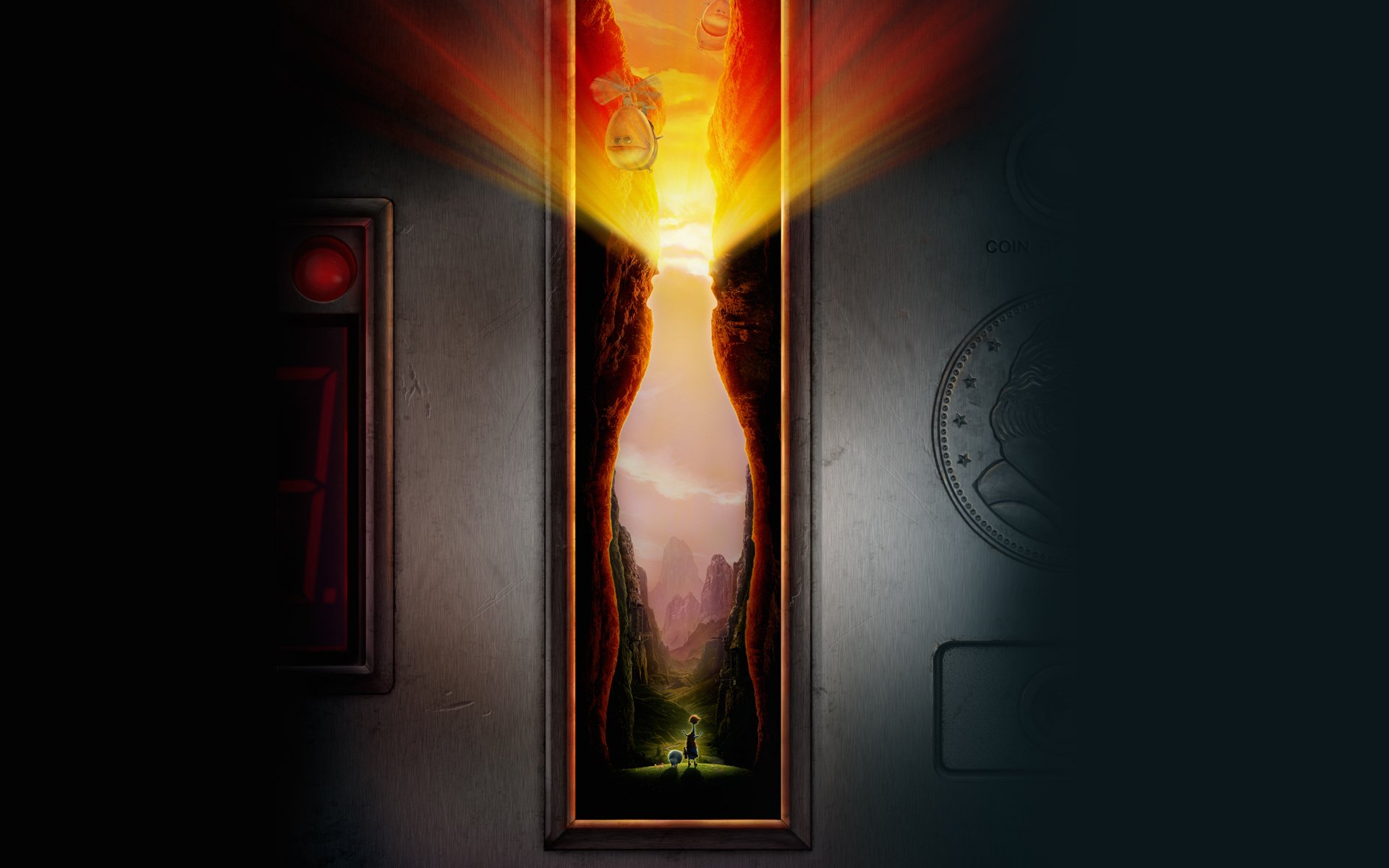 A picture on the wall of a Coca-Cola bottle, with a built-in landscape and light from the neck