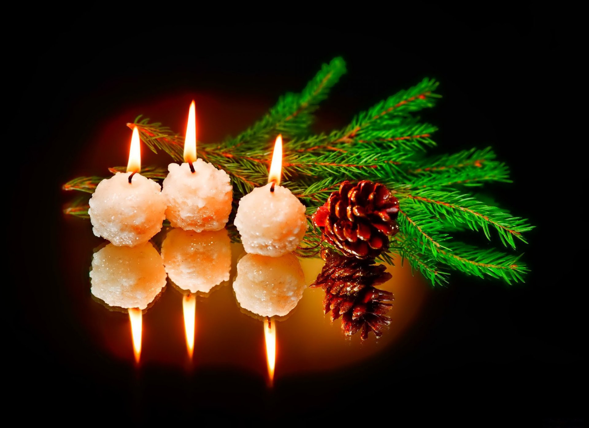New Year candles with a Christmas tree twig and a cone