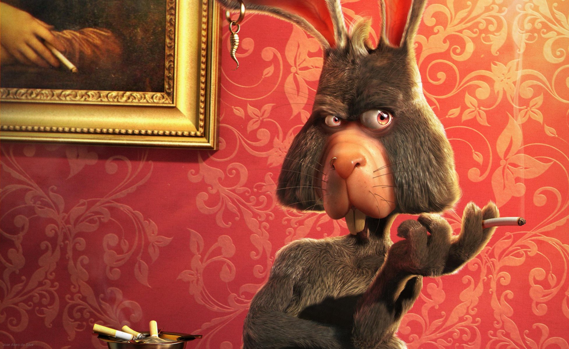 A rabbit with an earring in his ear and a cigarette