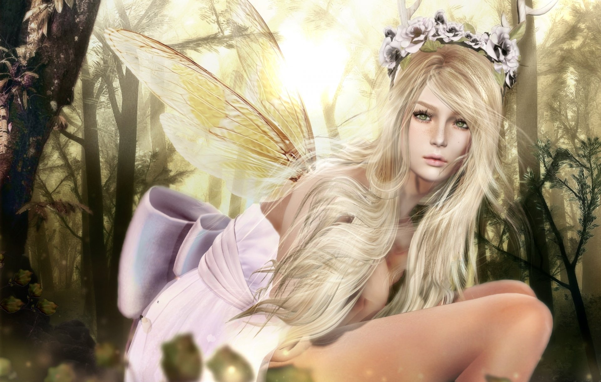 A girl in white with a wreath on her head is sitting in the grass