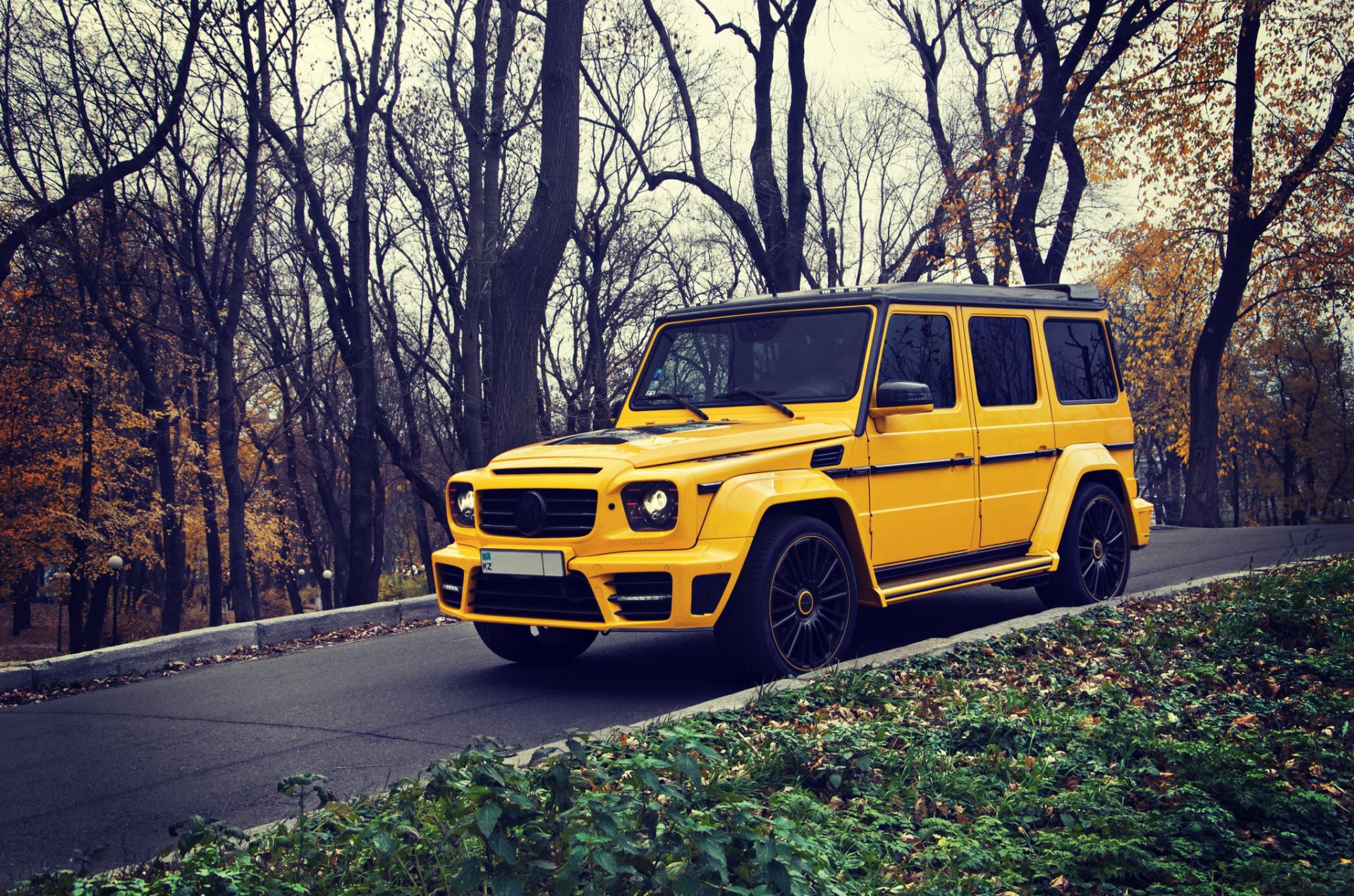 Yellow lamborghini and black bmw on the road against palm trees and cloudy sky