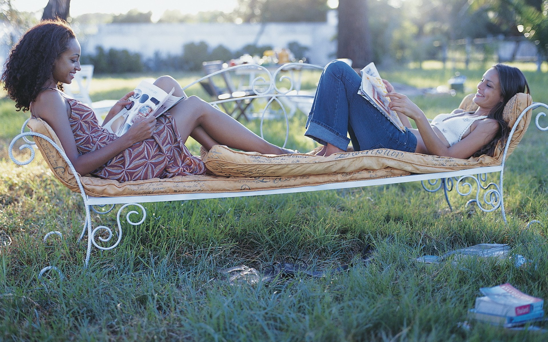 Two girls are lying on a bench and reading magazinesTwo girls are lying on a bench and reading magazines