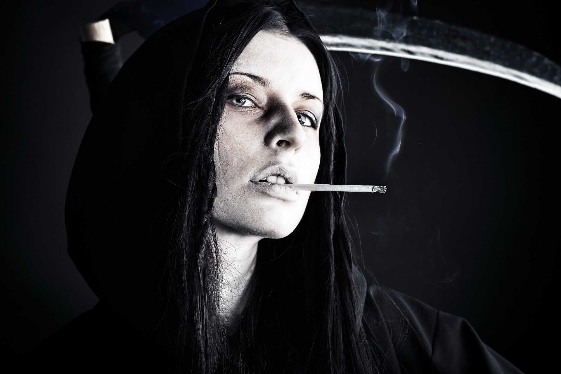 A red-haired girl in a long white dress and shoes stands over a skeleton in an old roomA red-haired girl in a long white dress and shoes stands over a skeleton in an old room