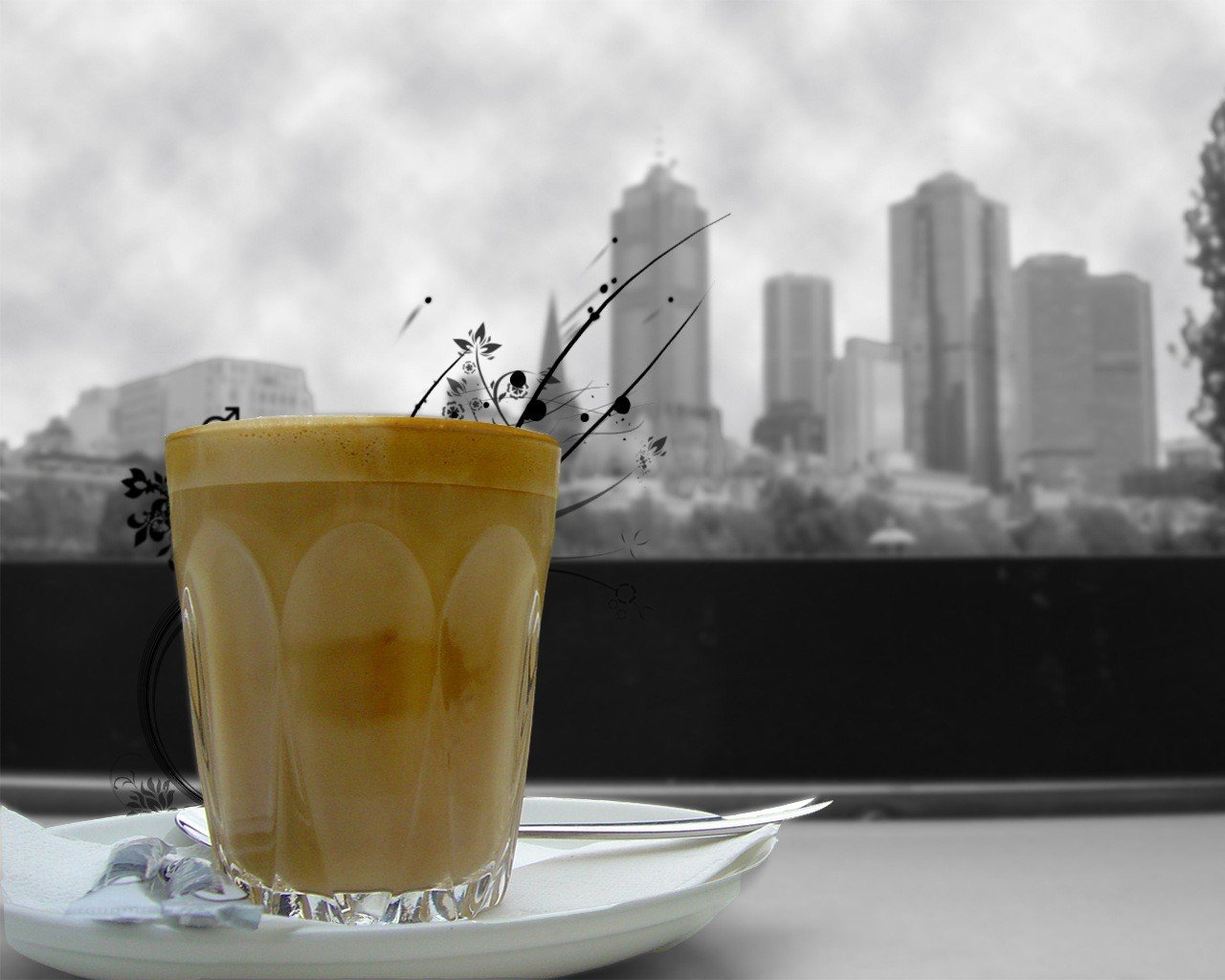 A glass cup with an orange drink on a white plate on a black and white background of the city