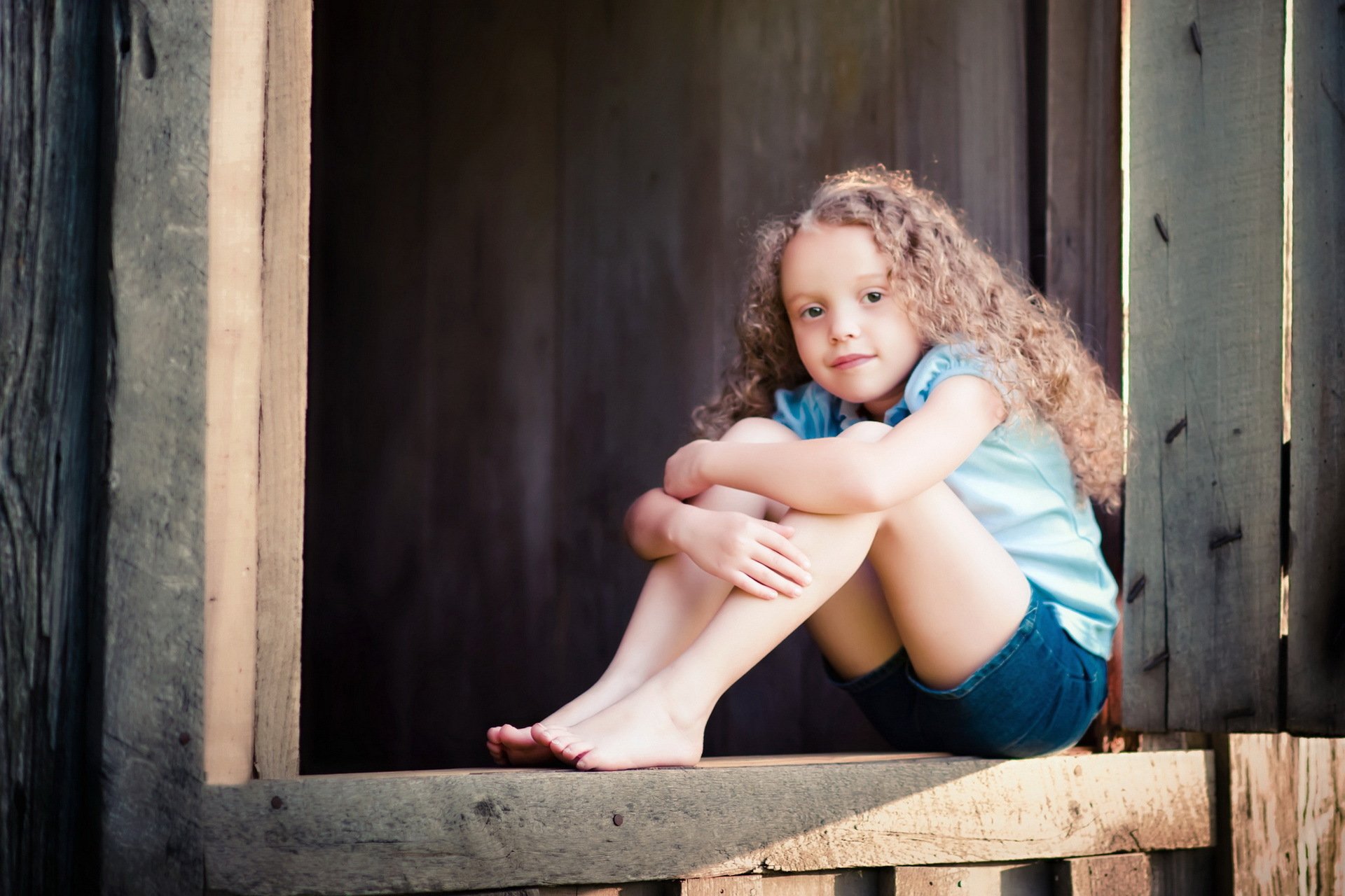 A girl with curly hair is sitting on the porch